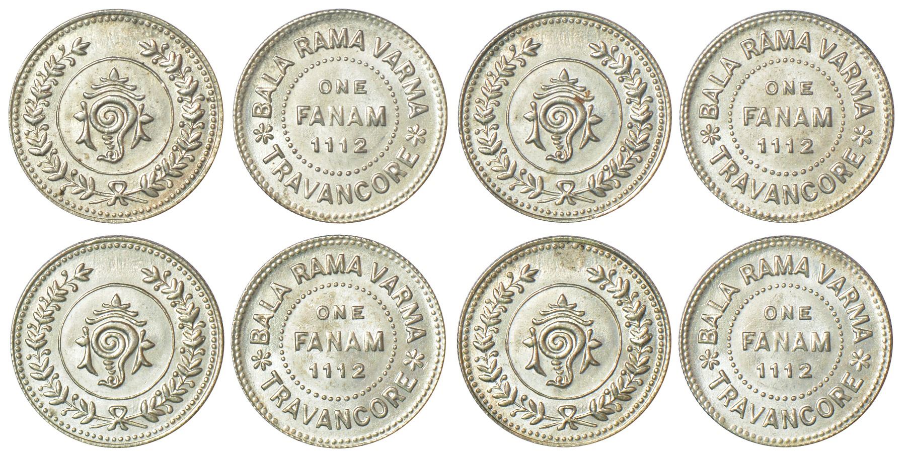 Travancore, Bala Rama Varma II (1924-1949 AD), silver fanam (4), ME 1112, KM 61, 1.49g, 1.52g, 152g and 1.53g. Obv: Sankha in sprays. Rev: Value and date in dotted circle. (4 coins)