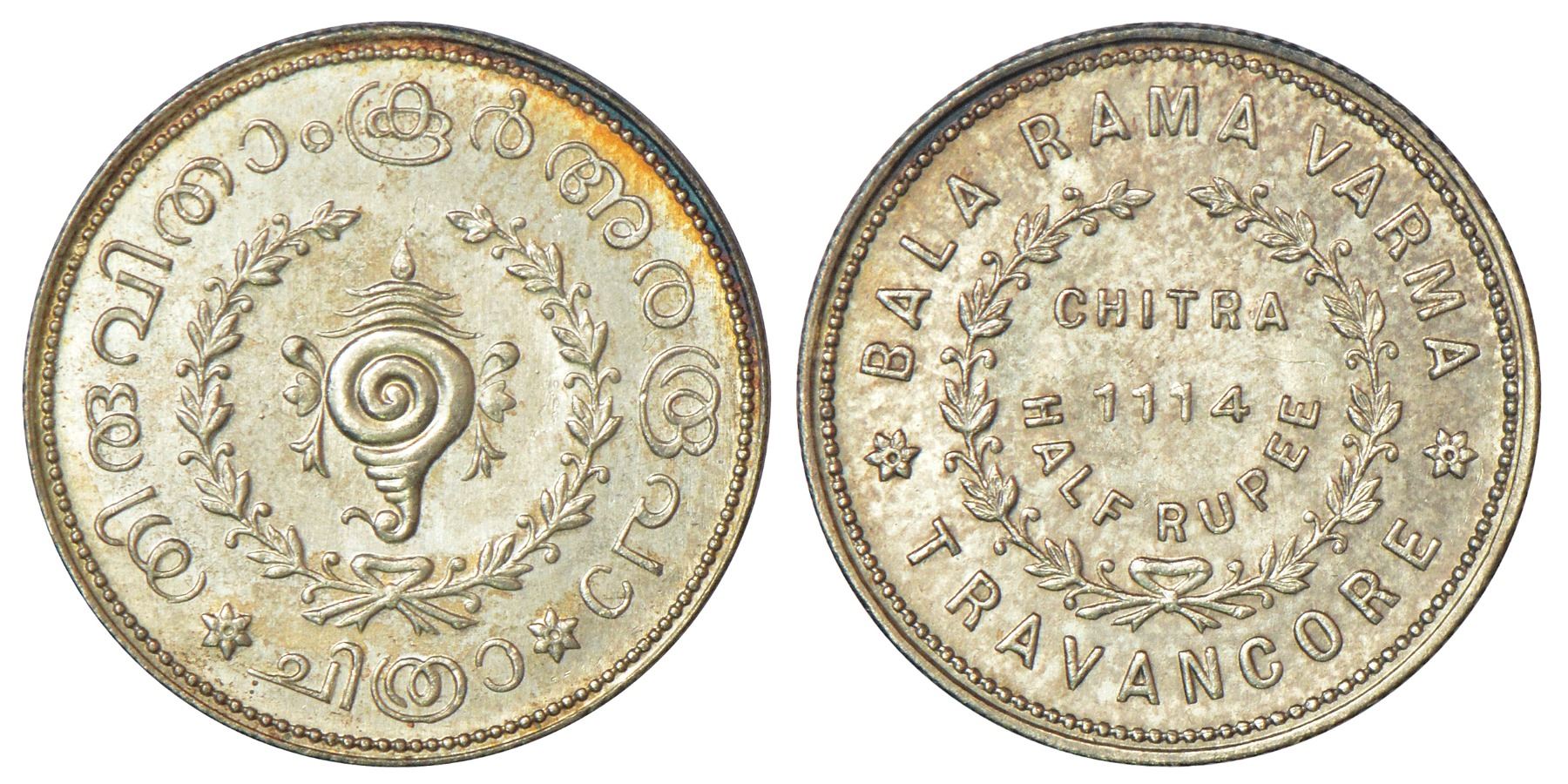 Travancore, Bala Rama Varma II (1924-1949 AD), silver ½ chitra rupee, ME 1114, initial B.R.V Engraved on edge, KM 64, 5.37g. Obv: Sankha in sprays. Rev: Value and date in sprays.