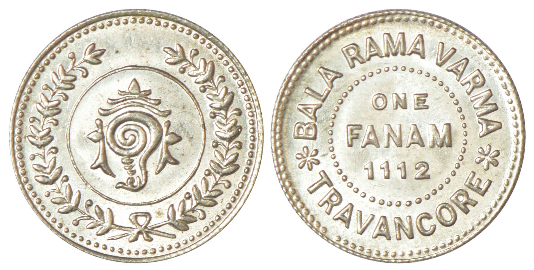 Travancore, Bala Rama Varma II (1924-1949 AD), silver fanam ME 1112, KM 61, 1.56g. Obv: Sankha in sprays. Rev: Value and date in dotted circle.