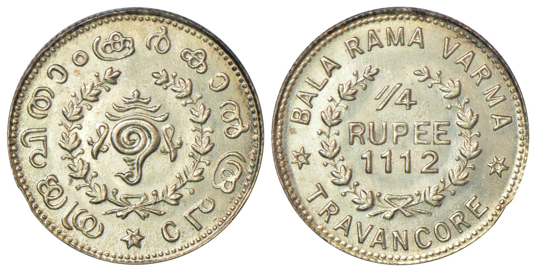 Travancore, Bala Rama Varma II (1924-1949 AD), silver ¼ rupee, ME 1112, initial B.R.V. Engraved on edge, KM 62, 2.70g. Obv: Sankha in sprays. Rev: Value and date in sprays.