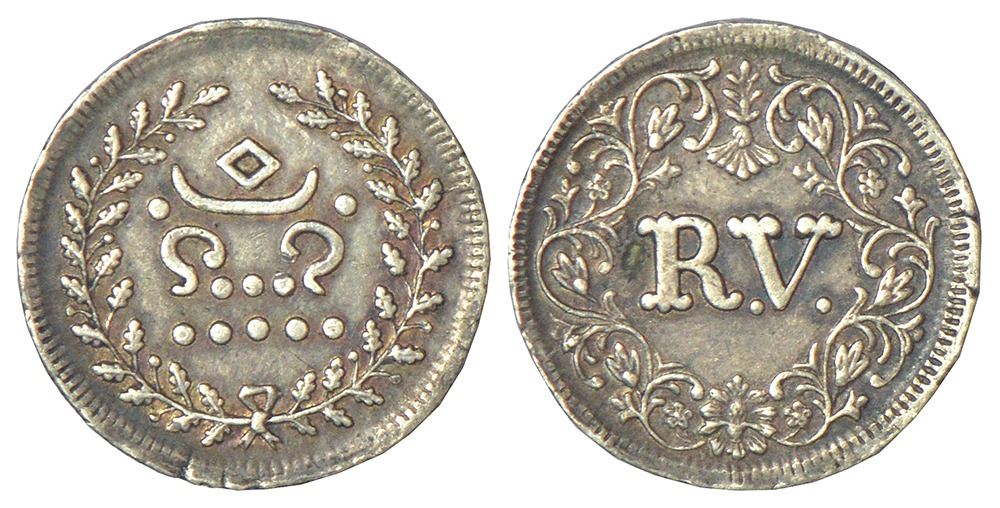 Travancore, Rama Varma IV (1860-1880 AD), silver velli fanam, ND (1864), large 'R.V.' in wreath, KM 24.1, 1.53g.