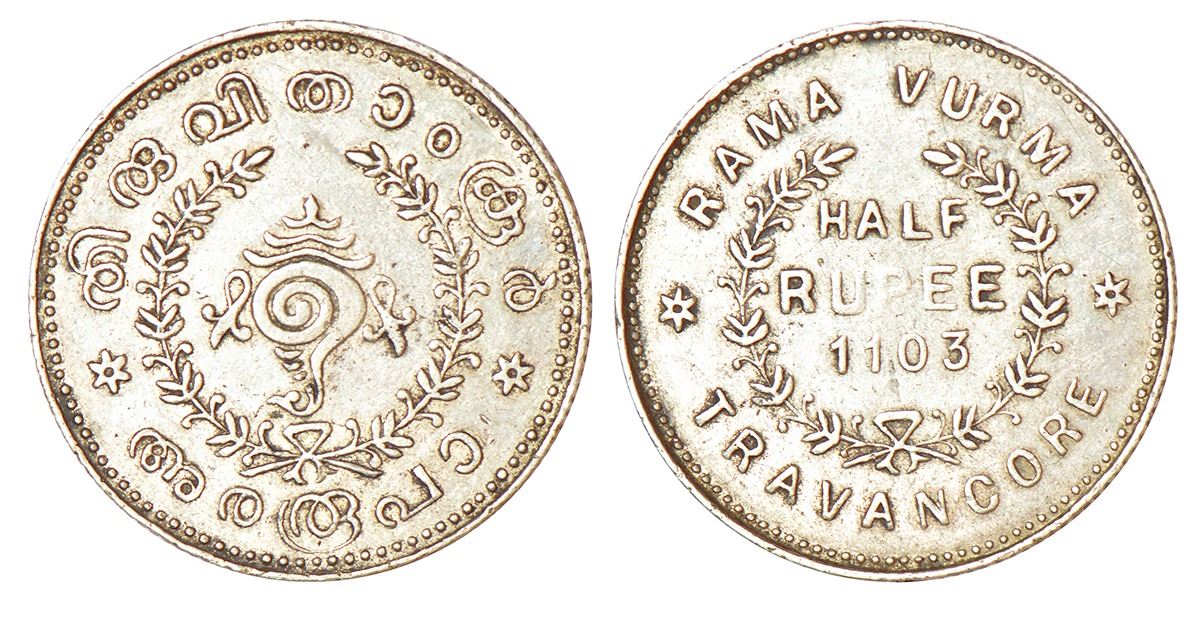 Princely States: Travancore, Rama Varma VI (1885-1924 AD), silver ½ rupee, ME 1103, initial R.V. engraved on edge, KM 53, 5.26g. Obv: Sankha in sprays. Rev: Value and date in sprays.