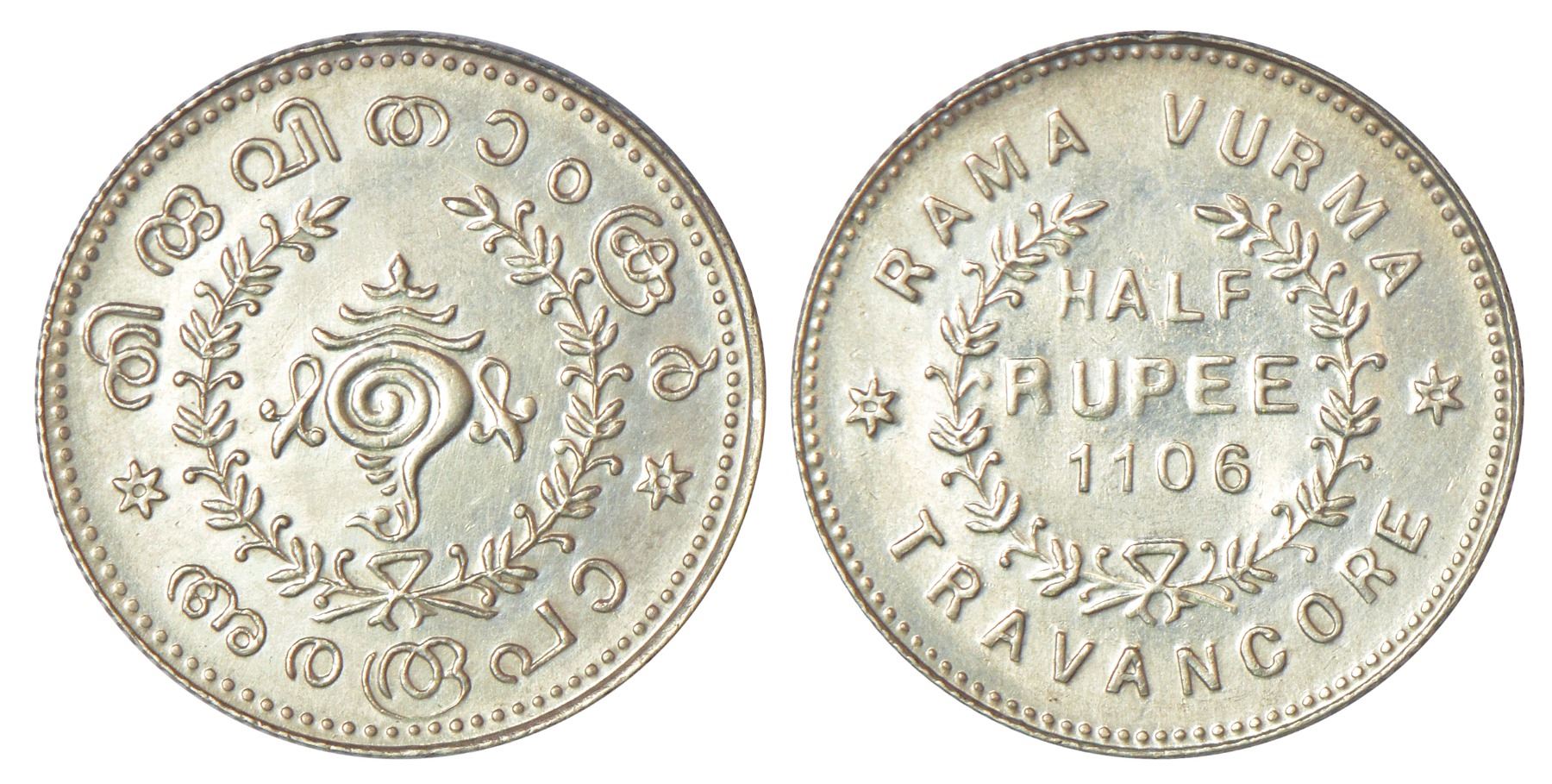 Travancore, Rama Varma VI (1885-1924 AD), silver ½ rupee, ME 1106, initial R.V. Engraved on edge, KM 53, 5.30g. Obv: Sankha in sprays. Rev: Value and date in sprays.