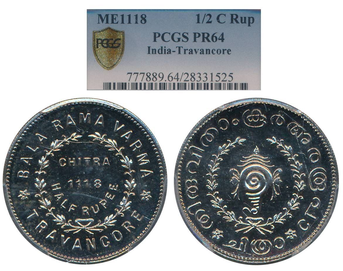 Bala Rama Varma II, Silver Chitra 1/2 Rupee, ME 1118, Obv: Conch Shell in sprays, Rev: Legend & date. Slab & Graded by PCGS 64.