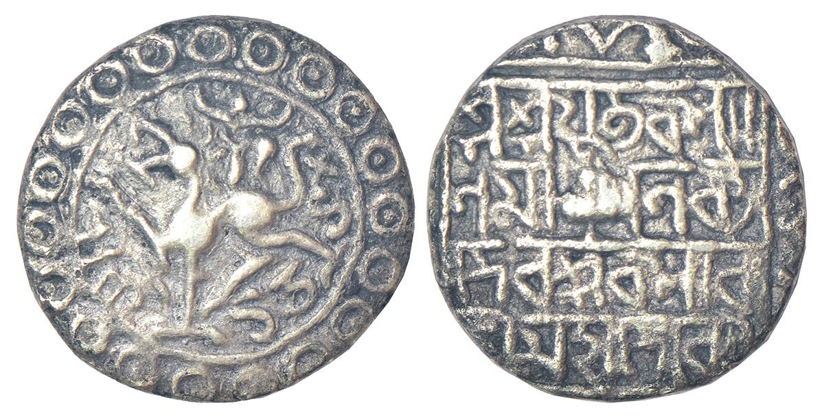 Tripura, Kalyana Manikya (1626-1660 AD), silver tanka, with citing Queen Kalavati, Sake 1548, R&B-T 205, 9.63g. Obv: Lion facing left, standard above, date below, all within a circle with an outer border of beaded annulets. Rev: Bangla legend Sri Sri Yuta Kalya/na ma(Siva Ling) nikya/Deva Sri Kalava/ti maha Devyau in four lines, within a square with ornamented border.