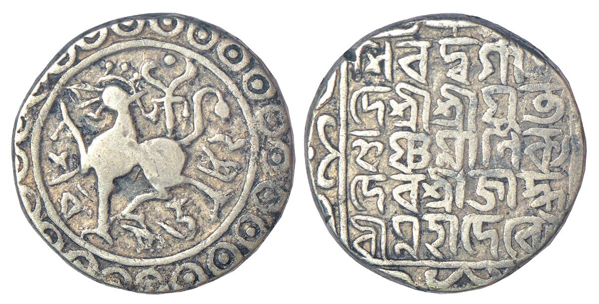 Tripura, Krishna Manikya (1760-1783 AD), silver tanka, with citing Queen Jahnavi, Sake 1582, R&B-T 254, 10.49g. Obv: Lion facing left, standard above, date below, all within a circle with an outer border of beaded annulets. Rev: Bangla legend Siva Durga Pa/de Sri Sri Yuta/Krishna manikya/Deva Sri Sri Jahna/vi Maha Devyau in five lines, within a square with ornamented border.