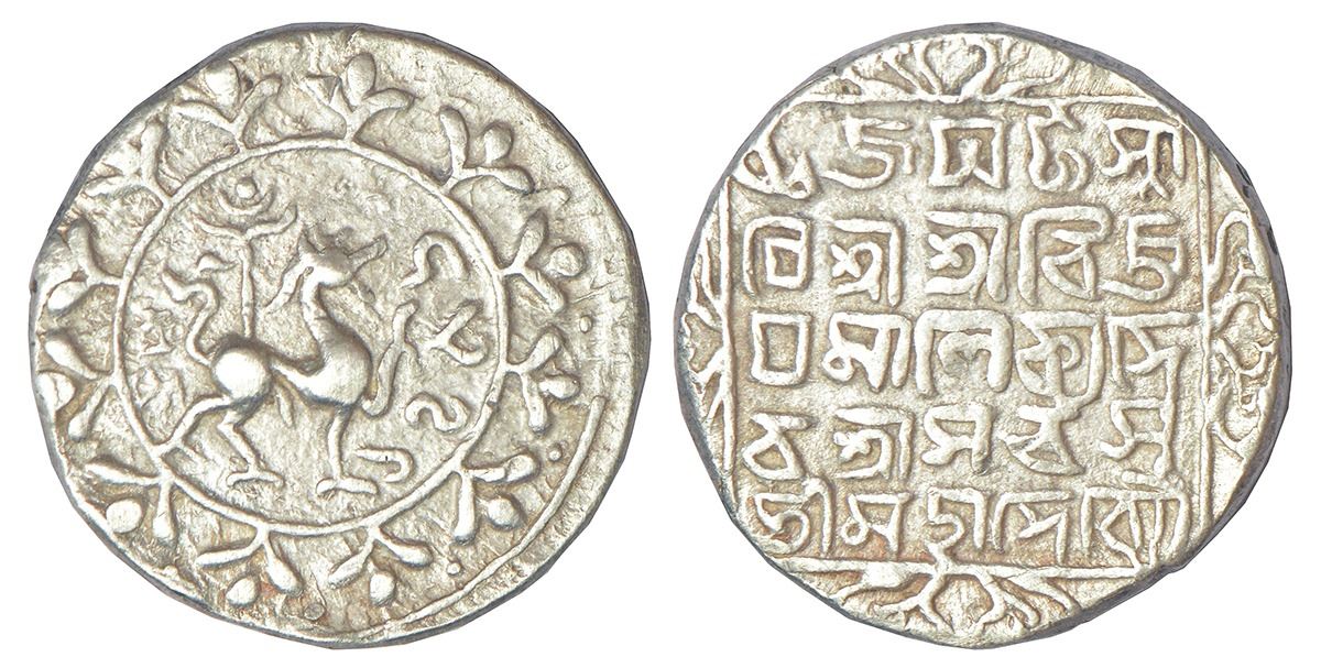 Tripura, Vijaya Manikya (1532-1564 AD), silver tanka, with citing Queen Sarasvati, commemorating a ritual bath at Dhvaja Ghat, Sake 1476, R&B-T 106, 10.43g. Obv: Lion facing right, standard and crescent with bead above, date to right; all within a circle with wide floral border. Rev: Bangla legend Dhvaja Ghata Sna/yi Sri Sri Vija/ya Manikya De/va Sri Sarasv/ti Maha Devyau in five lines within a square ornamental border.