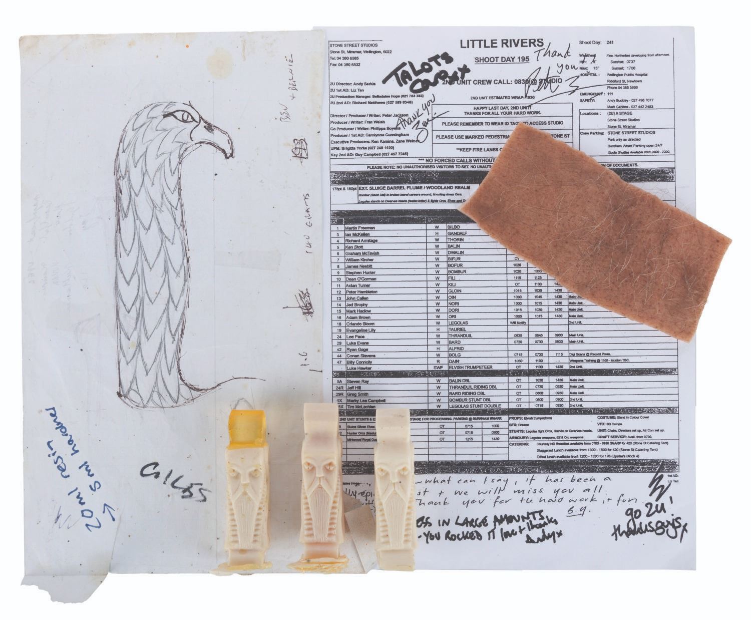 (Warner Bros., 2012-14) A selection of production souvenirs from The Hobbit trilogy. Included are three unfinished resin castings of Dwarf idols, a graphite and ink concept sketch for an Erebor treasure Elvish sword handle, a section of Bilbo’s silicone prosthetic feet, and a photocopy of a second unit call sheet for the final day of filming. Ranging in size from the 3.75” x 1” x 1” idol castings to the 8.25” x 11.75” call sheet, all of the items are in good, production-used condition.