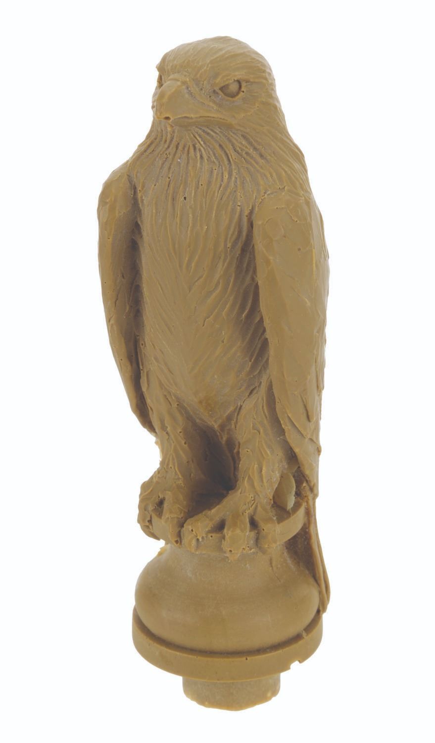 (Warner Bros., 2012-14) A selection of decor, props, and prototypes from production of "The Hobbit." Included are a cast falcon for Beorn's chess set, a piece of the Rivendell set, a foam cast horn from the Dol Guldur fortress, props from Dale's Market such as a red egg, an unfinished wooden chest with drawers, a lion statue, and two wooden pieces. Ranging in size from one 2.25” x 1.25” x 0.25” wooden piece to the 9.5” x 1.75” diameter horn, the items are all in very good production-used condition with light scuffs, wear, and paint loss.