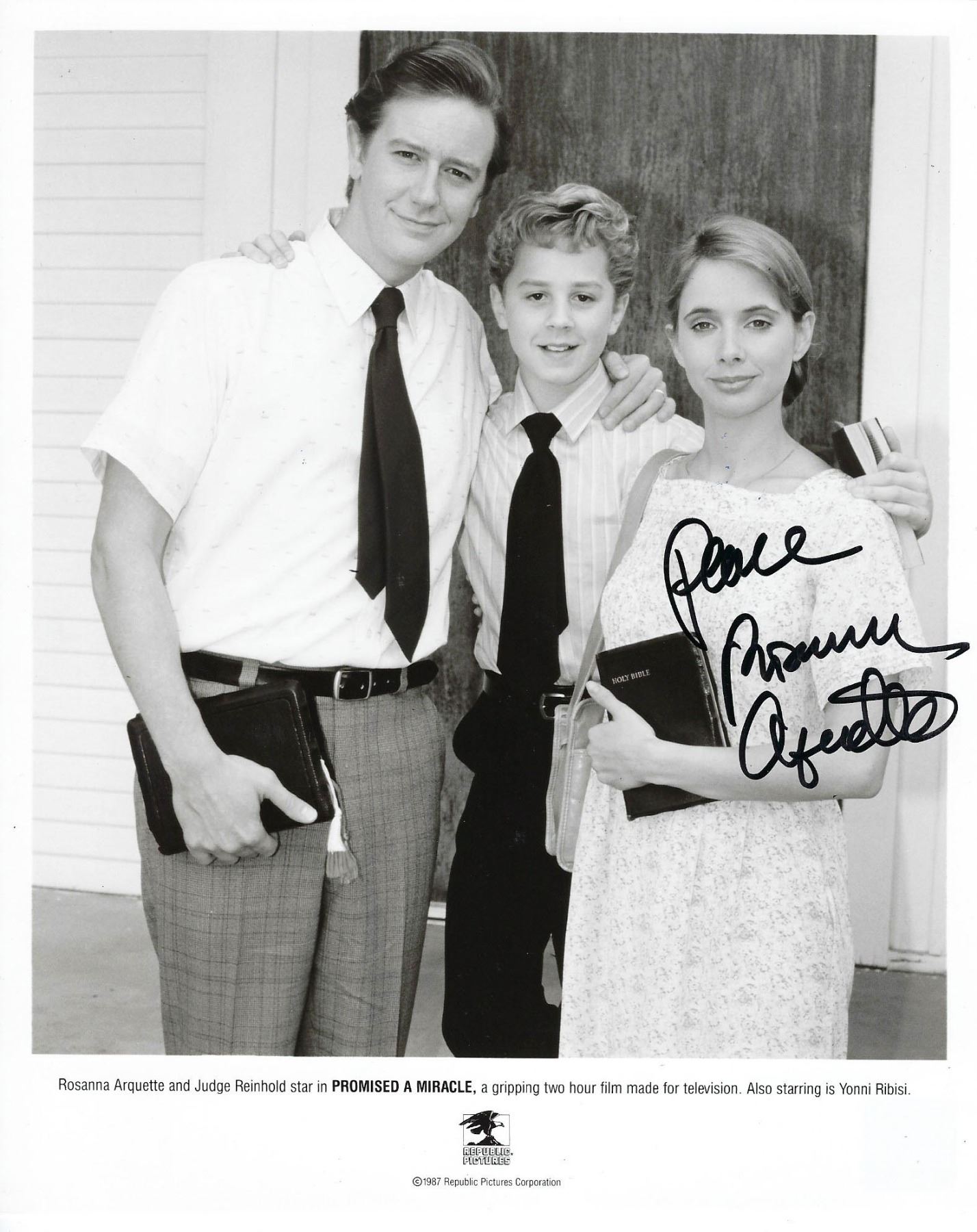 Promised a Miracle signed movie photo autographed by Rosanna Arquette. 8x10 inches
