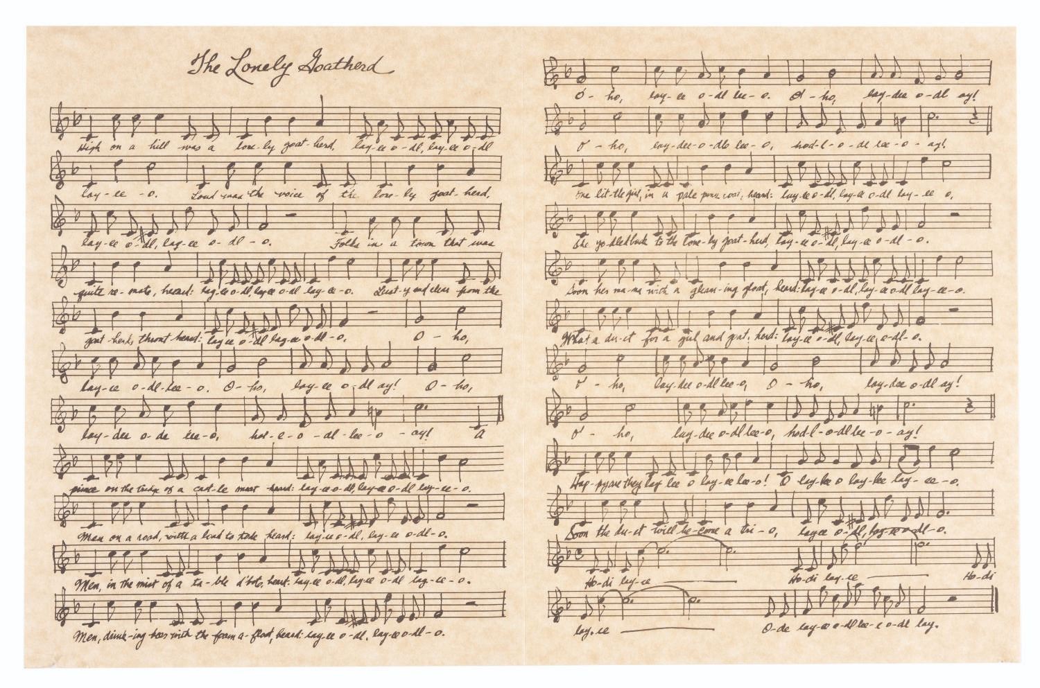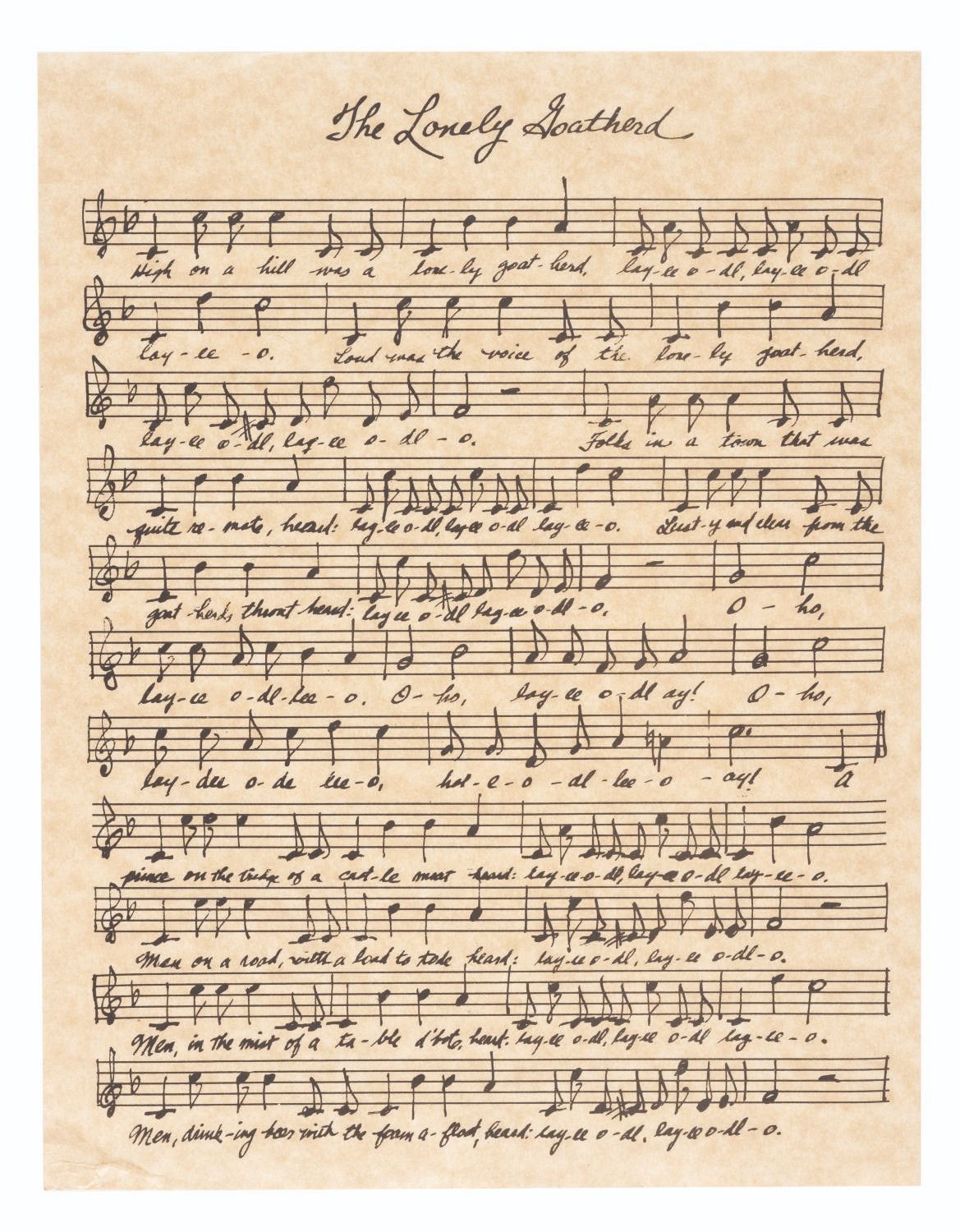(20th Century Fox, 1965) A production-made prop music sheet from "The Sound of Music.” Printed by the Earl Hayes Press, the oldest existing prop house in Hollywood since 1921, this sheet music for "The Lonely Goatherd” was created for the scene of the Van Trapp children performing the puppet show, though it is not seen in the film. Measuring 11” x 8.5” when closed and 11” x 17” when open, the sheet music displays in good condition with heavy creasing and tear to the bottom right corner.