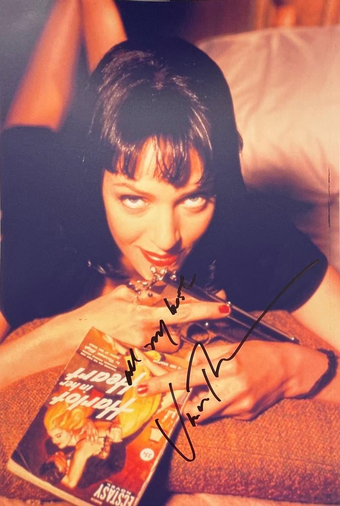 Pulp Fiction Uma Thurman facsimile signed movie photo. 8x10 inches. This item is a reprint of an original autograph