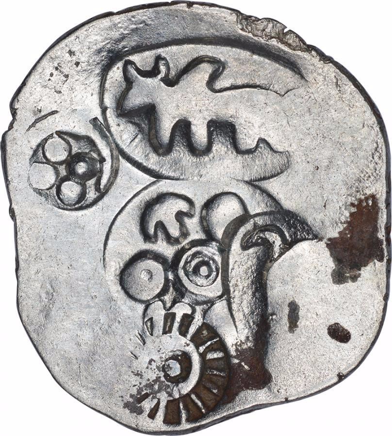 Punch-Marked Coin, Maghada Janapada, Silver Karshapana, Obv: four punches sun, bull, six armed wheel and four dots within circle, Rev: uniface, 4.68g, 23.0mm, about extremely fine, Scarce.