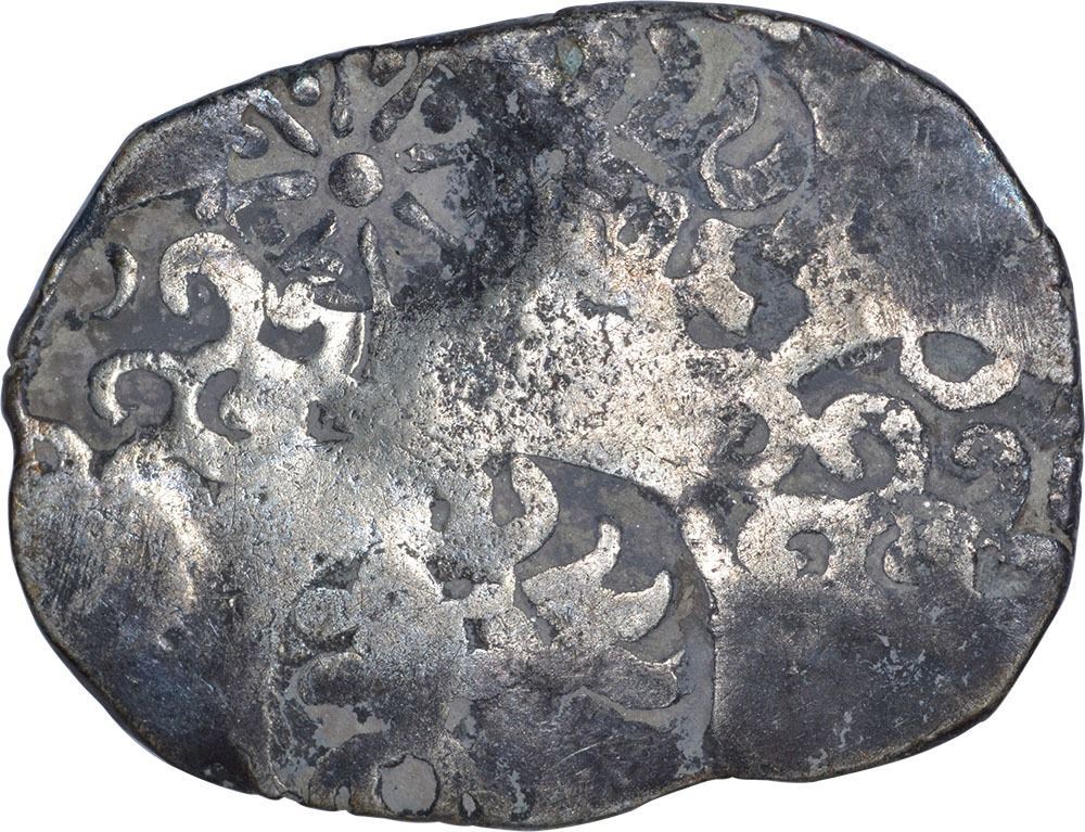 Punch Marked Coins, Kashi Janapada under Kosala Janapada (500 BC), Silver Vimshatika, Obv:four symbols type, sun,circle with whorled projections, eight-petal lotus flower, six armed wheel,Rev:squirrel-like elongated animal forms,eight-petal lotus flower, 4.70g, 29.22x21.74mm, about very fine, Very Rare.