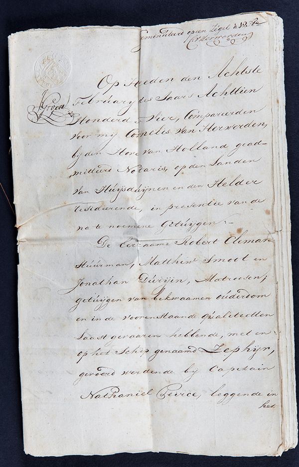 [quasi War With France] 1804 Dutch Document Relating To French Spoliation Claims. Twenty-page manuscript document in Dutch, dated 8 Feb. 1804, regarding the ship Zephyr, captained by Nathaniel Peirce. The Enlish docket says, "Protest, Exhibited to the President and Directors of the Newberry Port Marine Insurance Company, June 30 1804." Red wax seal on the 13th page. Untranslated; overall toning and light soiling.