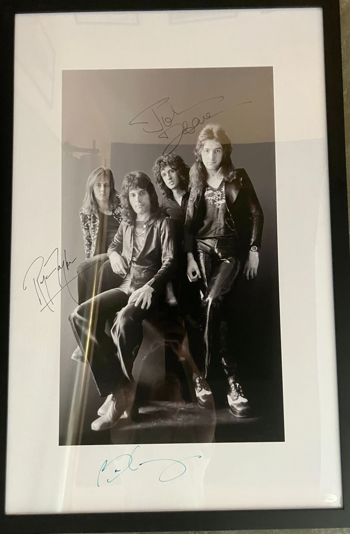 Queen band signed poster autographed by Brian May, John Deacon and Roger Taylor. 26x39 inches
