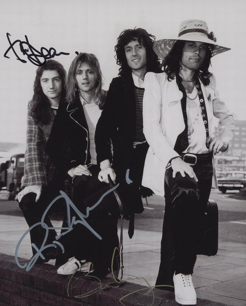 Queen signed photo autographed by Brian May, John Deacon, and Roger Taylor. 8x10 in. This item is a reprint of an original autograph.