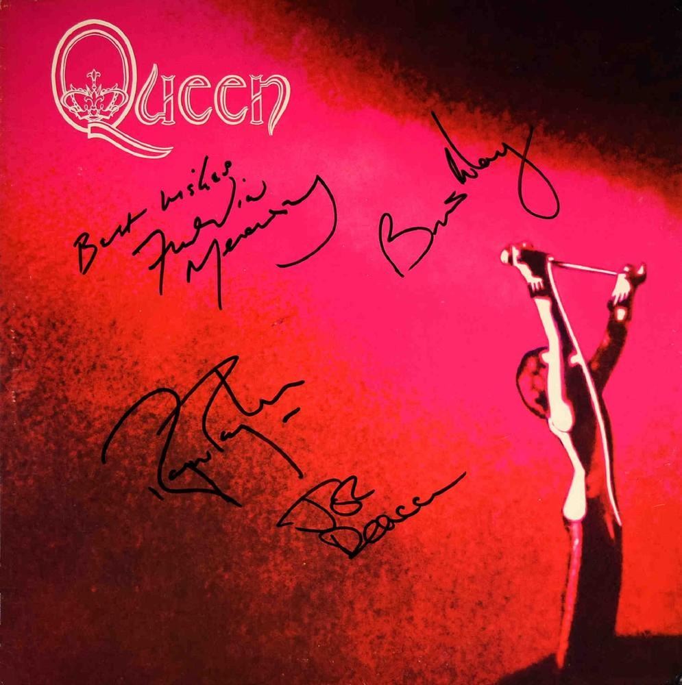 Queen 1976 News Of The World album. Signed: My Best Wishes Freddie Mercury, Brian May, Roger Taylor, and John Deacon.