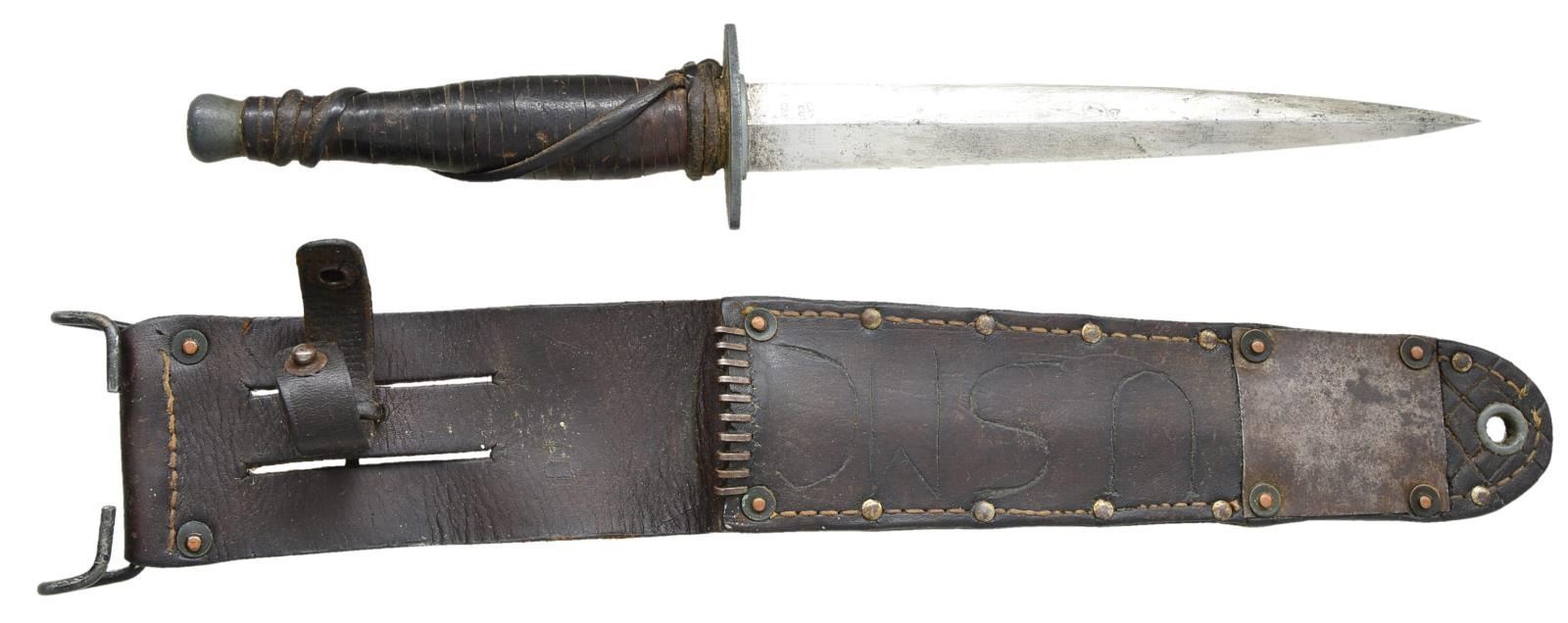 STILETTO BY CAMILUS. Overall length of knife: 12 1/4". Blade length: 7". This knife represents one of the rarest & most highly sought after US combat knives of World War II. The Marine Corps Raider’s stiletto was the first US designed fighting knife produced by a United States company after hostilities commenced. The knife was designed by Lt. Col. Clifford Shuey in 1941. Lt. Col. Shuey was the officer in charge of the Engineer Division of the Quartermaster Department at US Marine Corps Headquarters. It can plainly be seen that the USMC stiletto’s design was based on the Sykes Fairbairn designed British knife. Shuey’s knife was designed to be lightweight, inexpensive & easy to manufacture. The diamond section blade was topped by a zinc aluminum alloy hilt that was often covered by leather. This example is marked at the ricasso, “CAMILUS CUTLERY CO CAMILUS N.Y.”. Approx. 2-3" up from the guard the blade is etched w/ a scroll & “USMC”. The zinc alloy grip is completely wrapped w/ a leather thong to greatly improve stability of the Marine’s grip. The original scabbard is leather w/ a metal reinforcement near the tip. There is a zinc alloy lanyard hole at the base & a steel belt loop at the top. The front of the leather sheath has the letters, “USMC” carved into it. The back has the name, “AL A PIANTE” carved into it. The name, “DUKE” can be seen lightly etched into the bottom steel reinforcement plate. A truly rare & wonderful identified WWII Marine Corps stiletto seldom found in today’s market. CONDITION: blade has a light gray finish. The USMC ribbon is light but visible. The Camilus markings are easily seen. The leather covered grip shows light wear. The scabbard shows overall moderate wear. (02-14930/BF). $2,400-3,200.