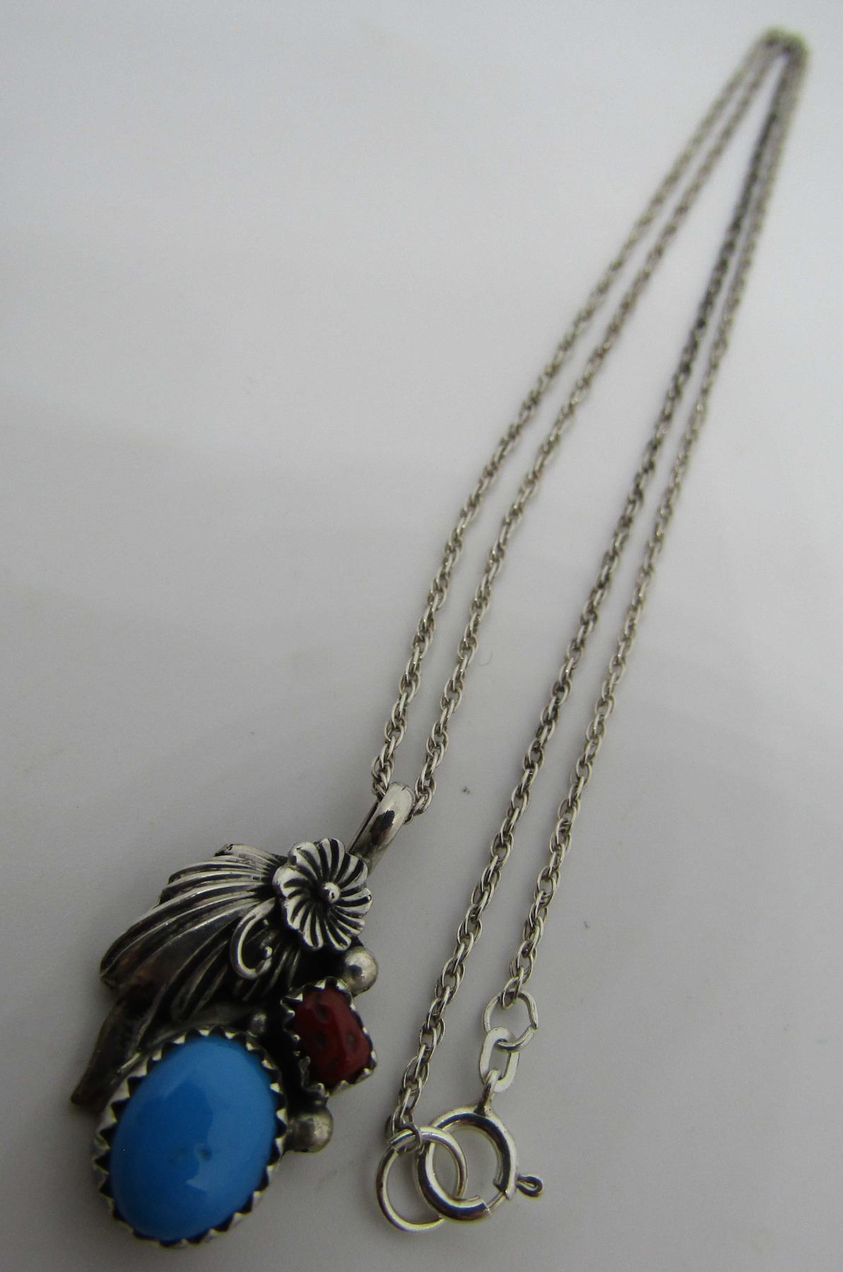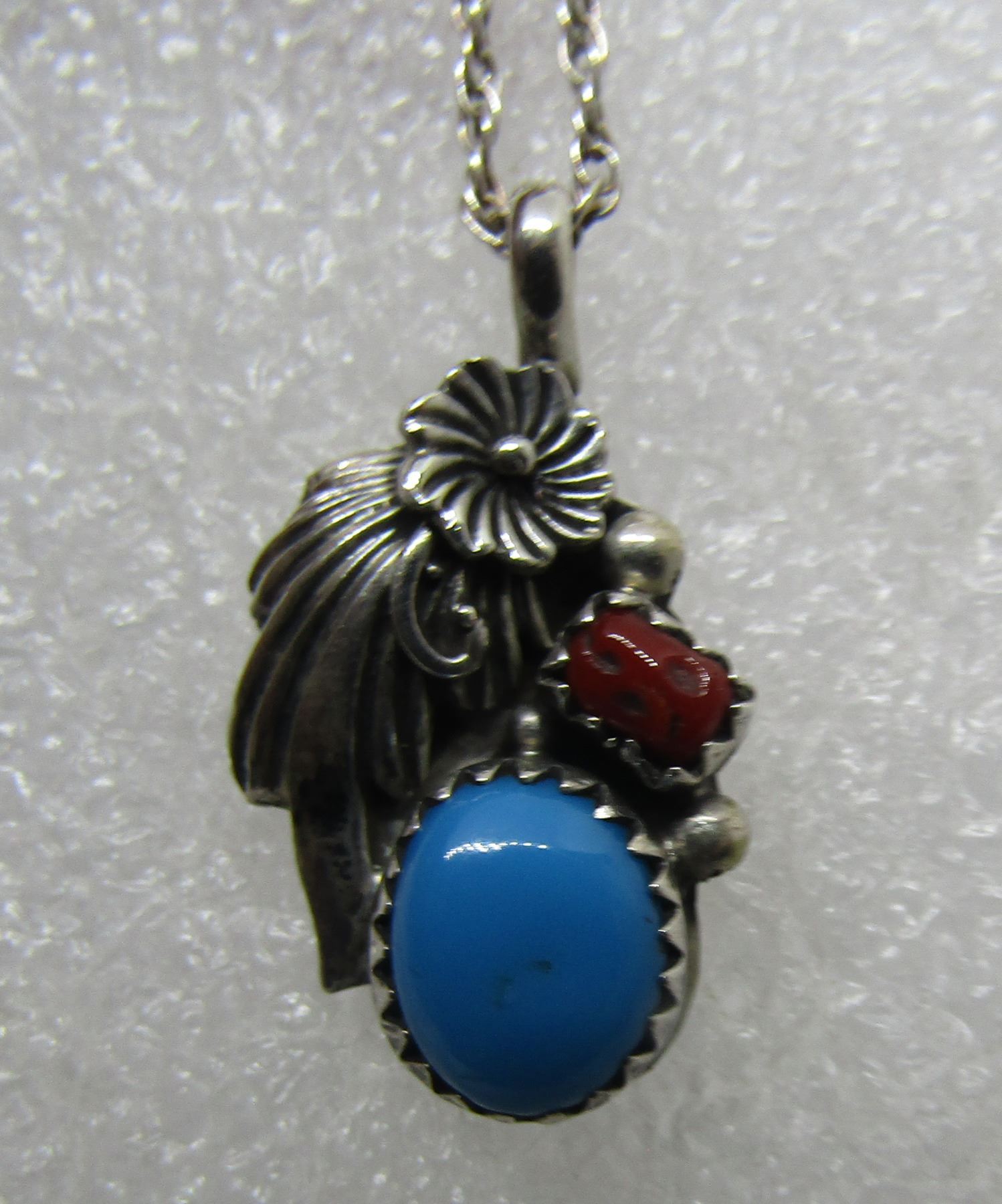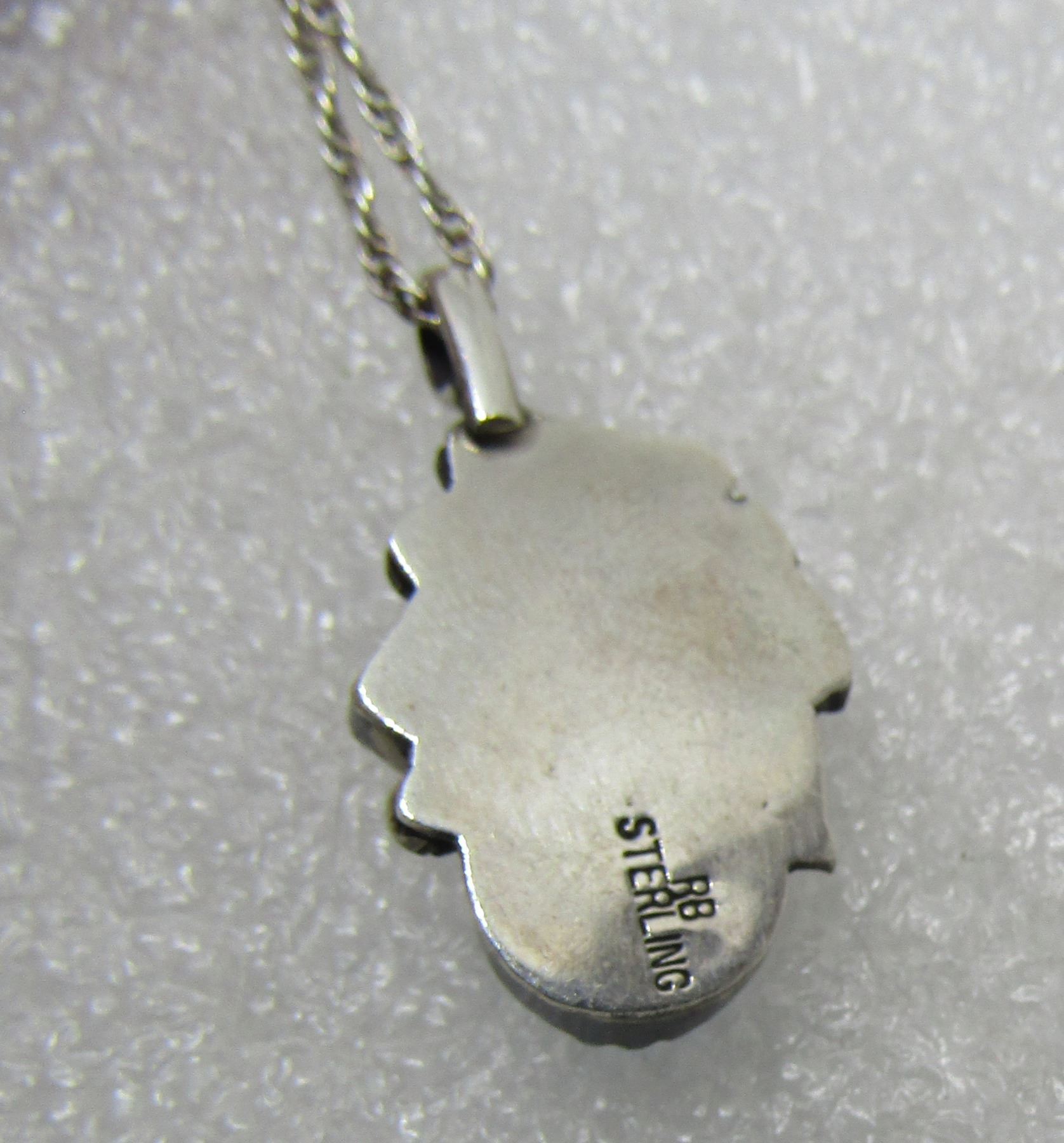 SILVER SQUASH BLOSSOM DESIGN HALLMARKED "RB STERLING" FOR RICHARD BEGAY / ROBERT BECENTI OR RUNNING BEAR. NATIVE AMERICAN SOUTHWEST INDIAN NAVAJO JEWELRY. LINK CHAIN 18", CHARM 25MM BY 15MM. WEIGHS 4.4 GRAMS,SLEEPING BEAUTY TURQUOISE EXCELLENT CONDITION VINTAGE ESTATE. USA SHIPPING $5.