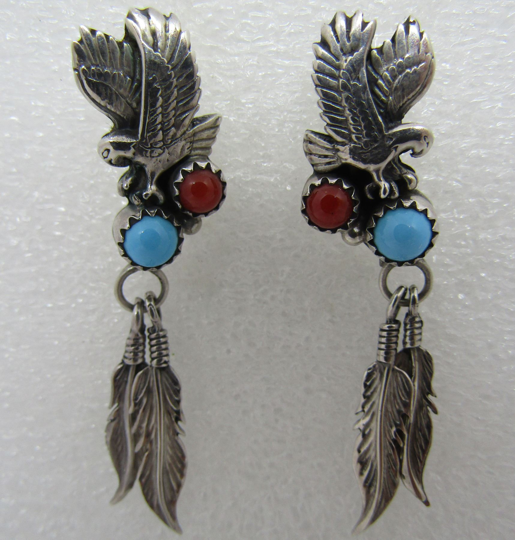 RED CORAL AND GEM BLUE TURQUOISE WITH EAGLE AND FEATHERS EARRINGS HALLMARKED "RB STERLING" FOR RICHARD BEGAY / ROBERT BECENTI OR RUNNING BEAR. NATIVE AMERICAN SOUTHWEST INDIAN NAVAJO JEWELRY. 46MM BY 13MM.WEIGH 6.9 GRAMS. EXCELLENT CONDITION VINTAGE ESTATE. USA SHIPPING $5.