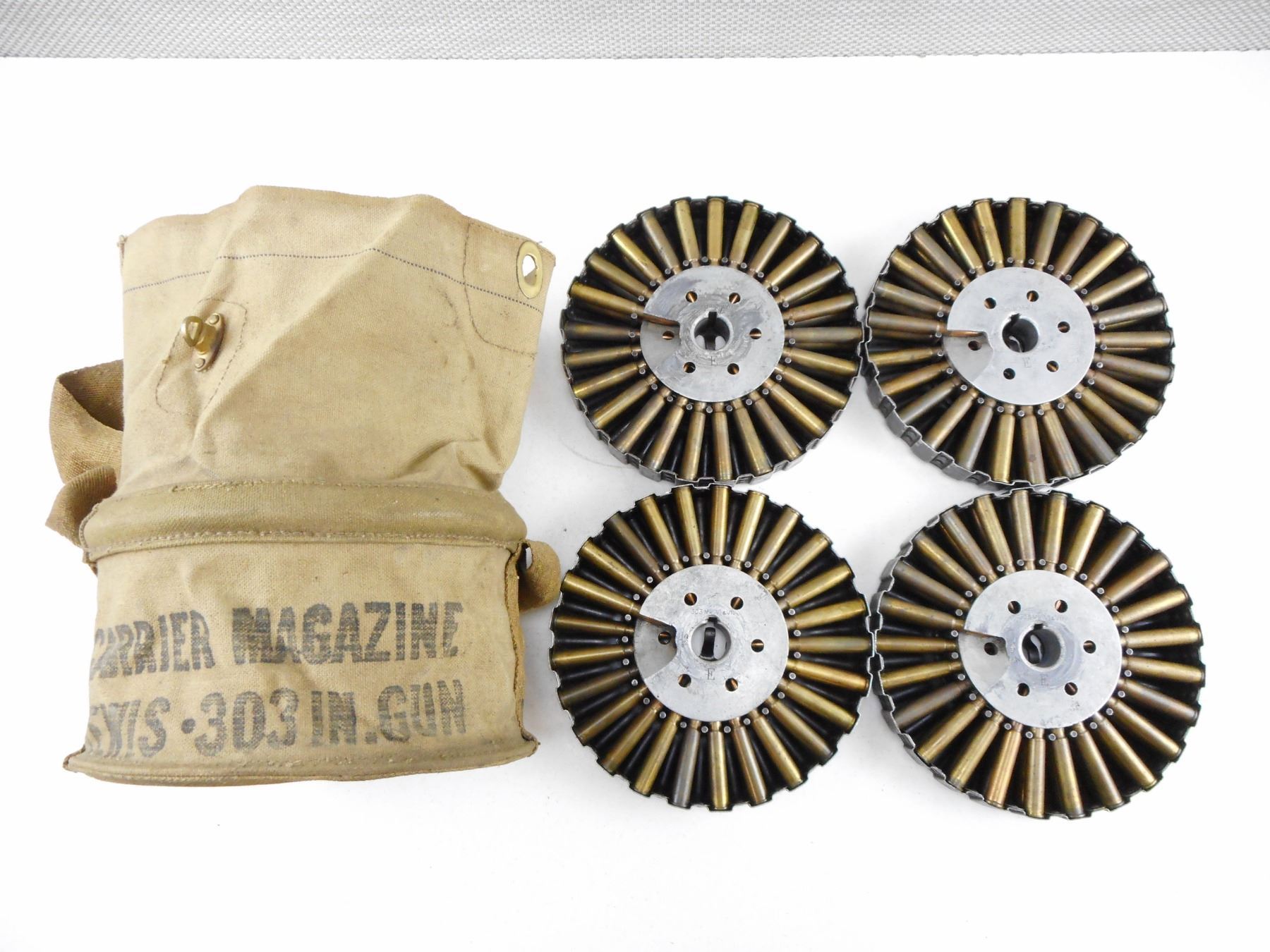 REALLY RARE - 8X47 ROUND PAN MAGAZINES FOR LEWIS MACHINE GUN. , 376 RNDS .303 AMMO DATED FROM 1960'S IN 47 RND PAN MAGAZINES FOR LEWIS MACHINE GUN. 4 MAGAZINES ARE PACKED IN A CANVAS PANIER DATED 1915 ( NICKNAMED LEWIS BUCKETS), THE OTHER 4 ARE PACKED IN CANVAS BAGS DATED 1918 - 2 MAGAZINES PER PACK. ALL RNDS ARE IN ORIGINAL METAL CHEST. ONE END OF STRAP ON METAL CASE IS BROKEN