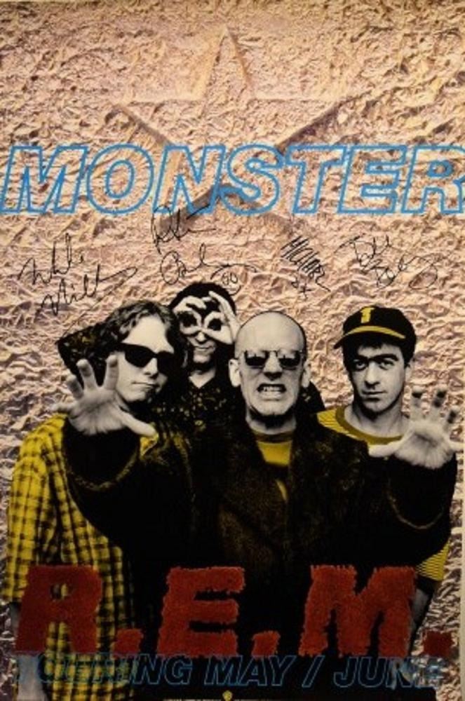 REM 24 in. by 36 in. Monster promotional poster autographed by Michael Stipe, Peter Buck, Mike Mills and Bill Berry.