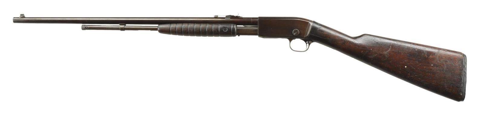Cal. 22 S, L, LR. S# 377482. Bbl. 21". Mfg. 1909-1936. Smooth rnd. bbl. w/ dovetailed front & elevation adj. rear sight. Ribbed forend. Plain hardwood shoulder stock w/ aftermarket buttplate. CONDITION: exposed metal surfaces appear to be reblued at some point & retain a fairly dark attractive finish w/ visible thinning towards rear of receiver & on feed tube. Stocks have been refinished & possess several dings & impressions. Shoulder stock has several cracks in grip area rear of receiver. Bore illustrates some pitting. Fire control mechanism appears to function correctly when cycled by hand. ROVENANCE: Estate Collection of Jack Verret Sr. (22-805/JZ). CURIO. $100-200.