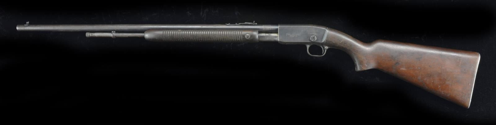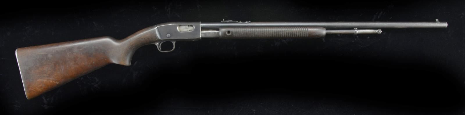 Cal. 22 S, L, LR. S# 146320. Bbl. 24". Mfg. 1936-1954. A slide action rimfire rifle chamber in 22 S, L, or LR. Rnd. bbl. w/ drift adj. front & elevation adj. rear sights. Hammerless action. Tube fed ribbed forend w/ smooth shoulder stock terminated w/ knurled aluminum buttplate. CONDITION: receiver & bbl. retain a fair amount of finish w/ heavily scattered patina, thinning primarily on tube mechanism & at 6 o'clock on receiver. Stocks are dark & stained w/ several impressions. Buttplate retains about 50% finish. Bore is dark yet still retains decent rifling. Fire control mechanism appears to function correctly when cycled by hand. PROVENANCE: Estate Collection of Jack Verret Sr. (22-808/JZ). CURIO. $200-400.
