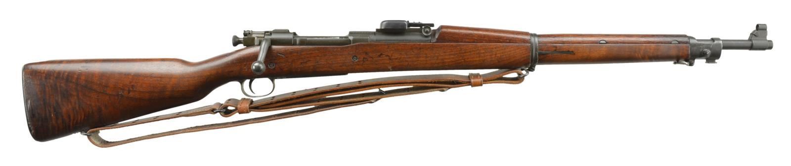 Cal. 30-06. S# 3228993. Bbl. 24" marked "RA" over flaming bomb w/ "7-42" date. Hooded blade front sight. Graduated leaf rear sight w/ flip up slide on sheet metal cover marked "P.J. O'HARE / SOUTHORANGE, NJ. MADE IN U.S.A." Milled bottom metal. Scant style stock & handguard of nicely grained walnut w/ trapdoor steel buttplate. Comb of stock at buttplate peak is stamped "0". Toeline has a "P" firing proof. Left side of stock is stamped "RA" w/ a rectangular stamp that appears to read "AAS". Military leather sling on original swivels. UNATTACHED ACCESSORIES: plastic tube cleaning kit in butt compartment. Canvas muzzle cover marked "U.S." & "WLMC / 1944". UC M1 bayonet & M7 scabbard in good overall condition. CONDITION: metal retains 0% parkerized finish. Stock has dark worn appearance showing numerous dents & handling marks. Bore has worn rifling. PROVENANCE: from the estate collections of Charles P. Obremski. (22-1304/DS). CURIO. $400-600.