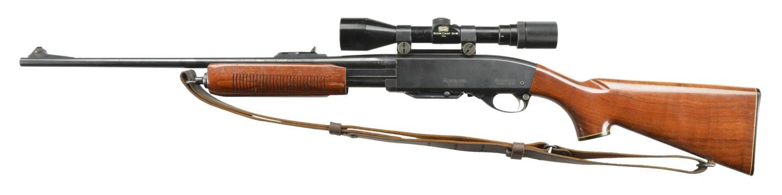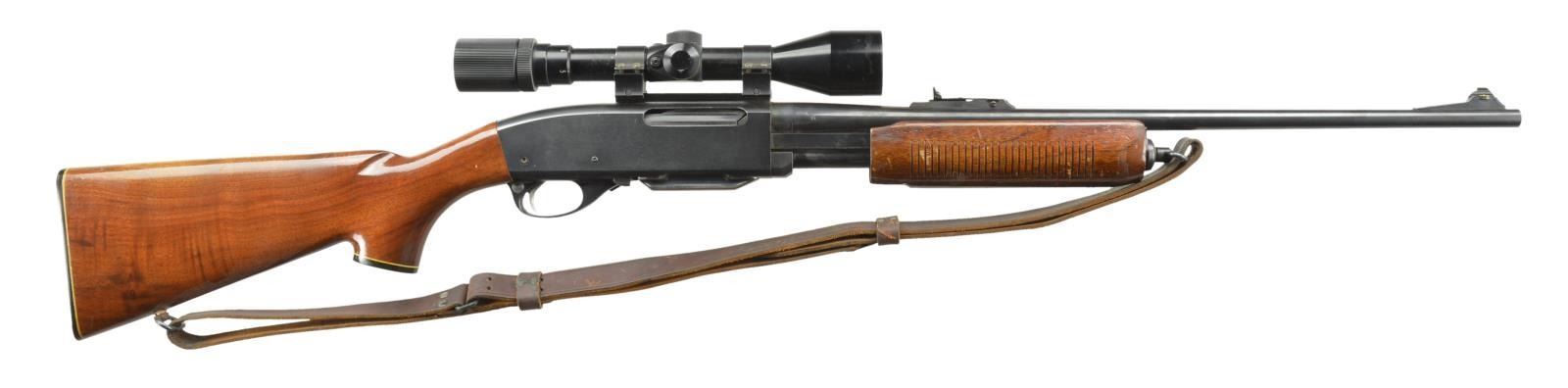 Cal. 30-06. S# 339245. Bbl. 22". Mfg. 1958-1961. Blued finish pump action rifle w/ dual action bars. Drift adj. front blade sight w/ elevation adj. rear sight. Receiver drilled & tapped w/ scope mt. & Bushnell Scope Chief 3X-9X scope w/ fine reticle. Ribbed forend plain rear stock w/ black grip cap & white spacer coinciding w/ checkered black buttplate & white spacer. Sling swivels front & rear w/ leather sling. MAGS: 1 factory 4 rd. CONDITION: exposed metal surfaces on receiver & bbl. retain the vast majority of their original finish w/ some thinning primarily in areas of mechanical intervention. More noticeable thinning on slide tube. Wood still retains much of its original high gloss finish bearing some impressions & drag lines primarily on forend. Shiny bore w/ sharp rifling. Fire control mechanism appears to function correctly when cycled by hand. PROVENANCE: Estate Collection of Jack Verret Sr. (22-832/JZ). CURIO. $200-300.