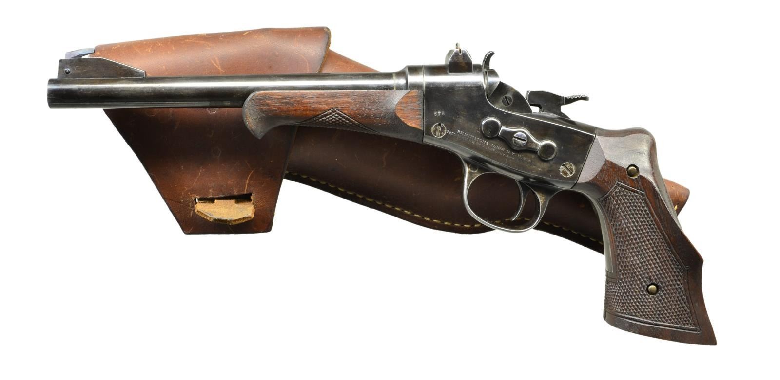 Cal. 22 Long Snapper. S# 676. Bbl. 8 3/8" w/ ramped pistol base having pin installed blade. Rear sight attached to receiver w/ windage adjustable blade. Replacement unmarked bbl. w/ distinct flair at breach. Hammer w/ wide rectangular spur coarsely checkered. Blued finish w/ proper frame markings to include “P” & “F.C.W.” martial marking. Mfg. early 1870’s. Custom checkered walnut stock set. Forend w/ decorative side panels at receiver & pronounced schnabel tip. Grip w/ elliptical shaped butt incorporating raised panel that contacts base of thumb for RH use. Gripstraps altered from original shapes; pistol built by Lloyd Roberts. Cal. (chamber cast confirmed; bbl. not marked) configuration approximates shortened 22K Hornet; appears enough material to rechamber to more common K Hornet. UNATTACHED ACCESSORIES: good plus simple handmade holster of thick cowhide leather having unusual slotted leather flap securing method & single wide angled belt loop marked “Lloyd Roberts” w/ 2 stamped Stars of David plus 4 more on front of flap. CONDITION: very good overall appearance as refinished w/ some thinning spots on bbl. Very good stock set w/ no visible means of forend attachment. Near excellent bore. (01-20326/NW). ANTIQUE. $200-300.