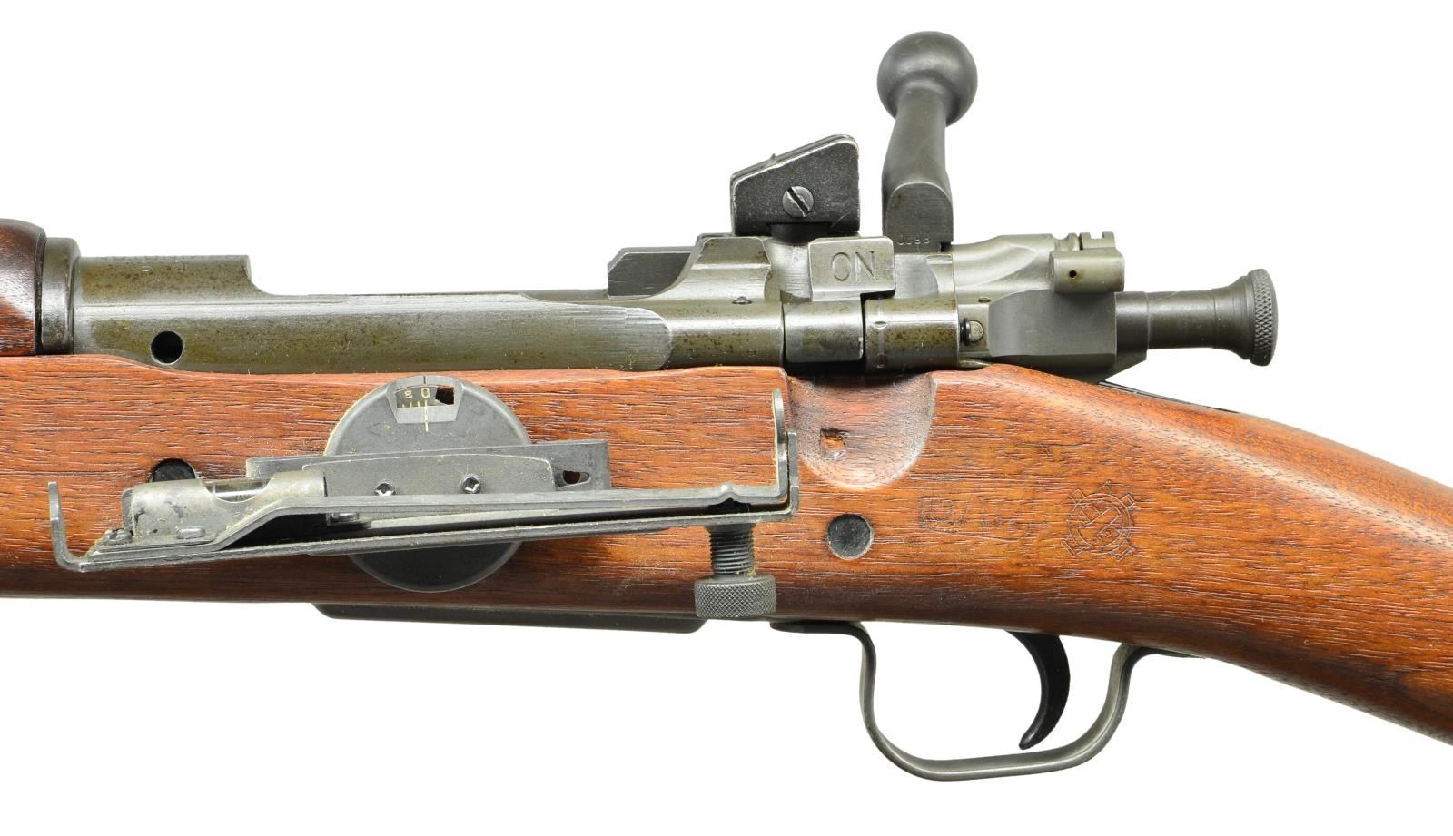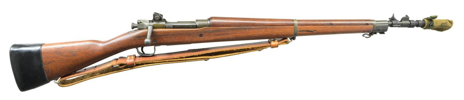 LAUNCHER, M15 SIGHT & RUBBER HEEL PAD. Cal. 30-06. S# 3822392. Standard configuration w/ "5/44" bbl. date & full Parkerized finish. Stock is by Springfield w/ ordnance markings & inspector's marks on left side. Stock is also fitted w/ M15 sight. A scarce accessory, a U.S. model M1 grenade launcher is marked "U.S. Rifle" "30M 1903 A1" on bottom along w/ Knapp-Monarch logo. Black rubber recoil pad is embossed "US", flaming bomb & "B200968" on rear. UNATTACHED ACCESSORIES: Launcher is fitted w/ "WLMC 1944" marked canvas cover. CONDITION: exceptionally fine. Metal parts retaining over 95% original Parkerized finish. Stocks are also very fine w/ only a few minor marks. Two groove bore is bright & shiny, mechanically good. Sight, grenade launcher & recoil pad are also very fine. An interesting Springfield variant. PROVENANCE: from the estate collections of Charles P. Obremski. (22-1301/MGM). CURIO. $900-1,200.