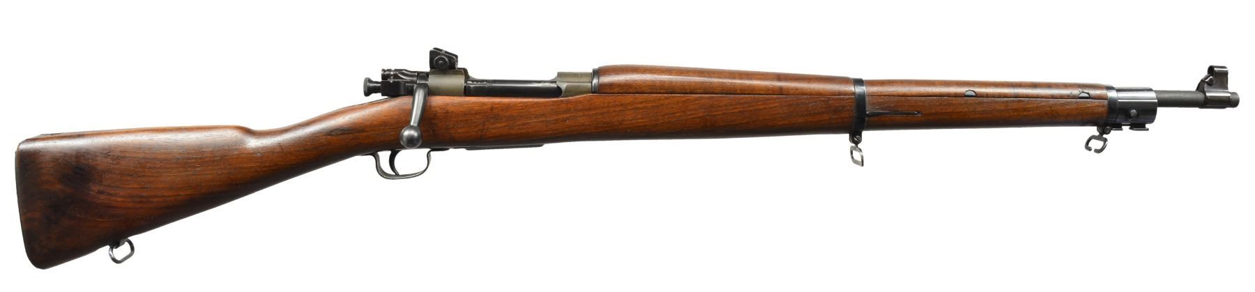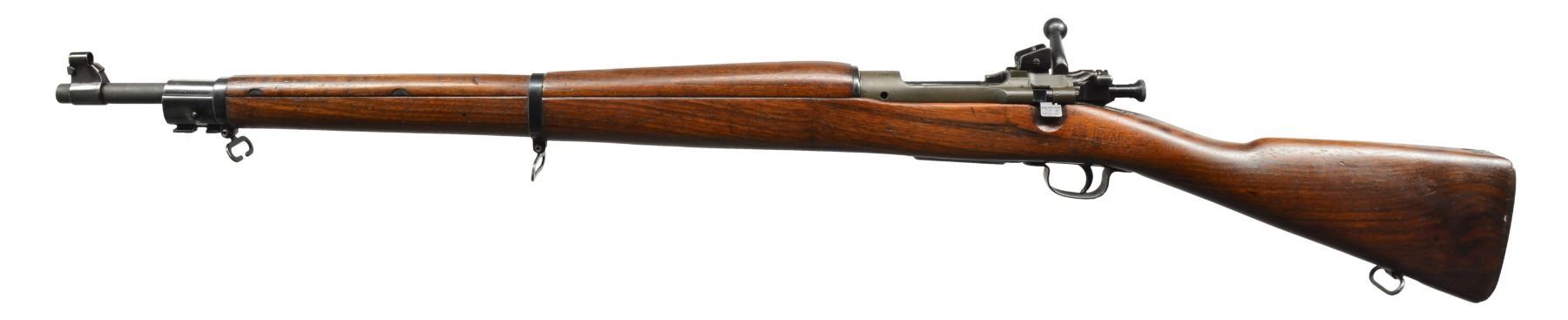 Cal. 30-06. S# 3384825. Bbl. 24" is marked behind front sight "RA" & flaming bomb & "1-43". Has adj. aperture rear sight. Blade front sight. Front sight has stamped protective cover. Bolt is marked underneath handle "1". Scalloped bolt sleeve marked "1". Has mag. cut off marked "R". Has all stamped furniture, including fine checkered trap buttplate & sm. trigger guard bow. Matching walnut straight grip stock set w/ cross pins. Stock is marked on left side w/ box "FJA" & crossed cannons. Marked behind trigger guard w/ encircled "P" & "11". Marked ahead of trigger guard w/ numerous inspector marks. Has plastic oiler w/ cleaning thong in butt. CONDITION: stock set has very good original finish w/ light wear & scratches. Has WWII type parkerizing w/ greenish cast. Bolt is black. Stamped parts are finished blue. Near excellent 4 grooved bore. (20-1305/RW). CURIO. $500-700.
