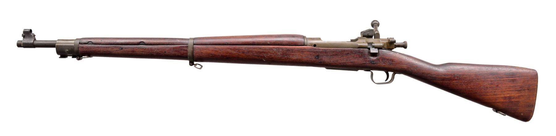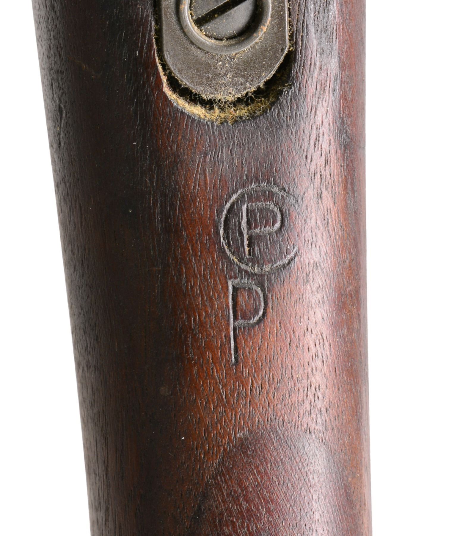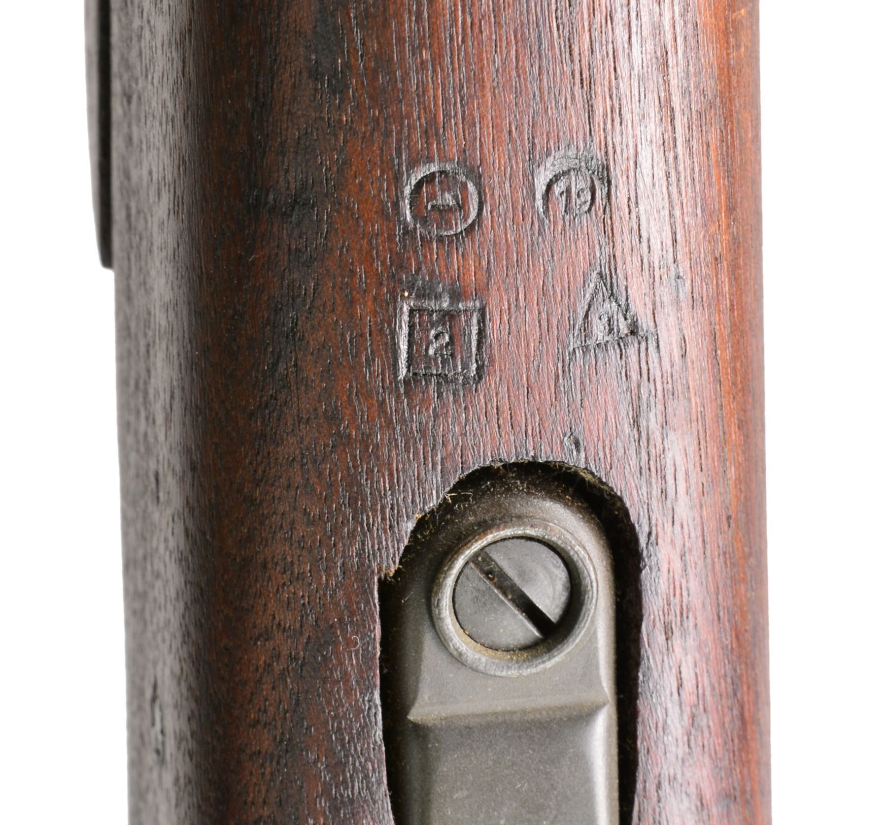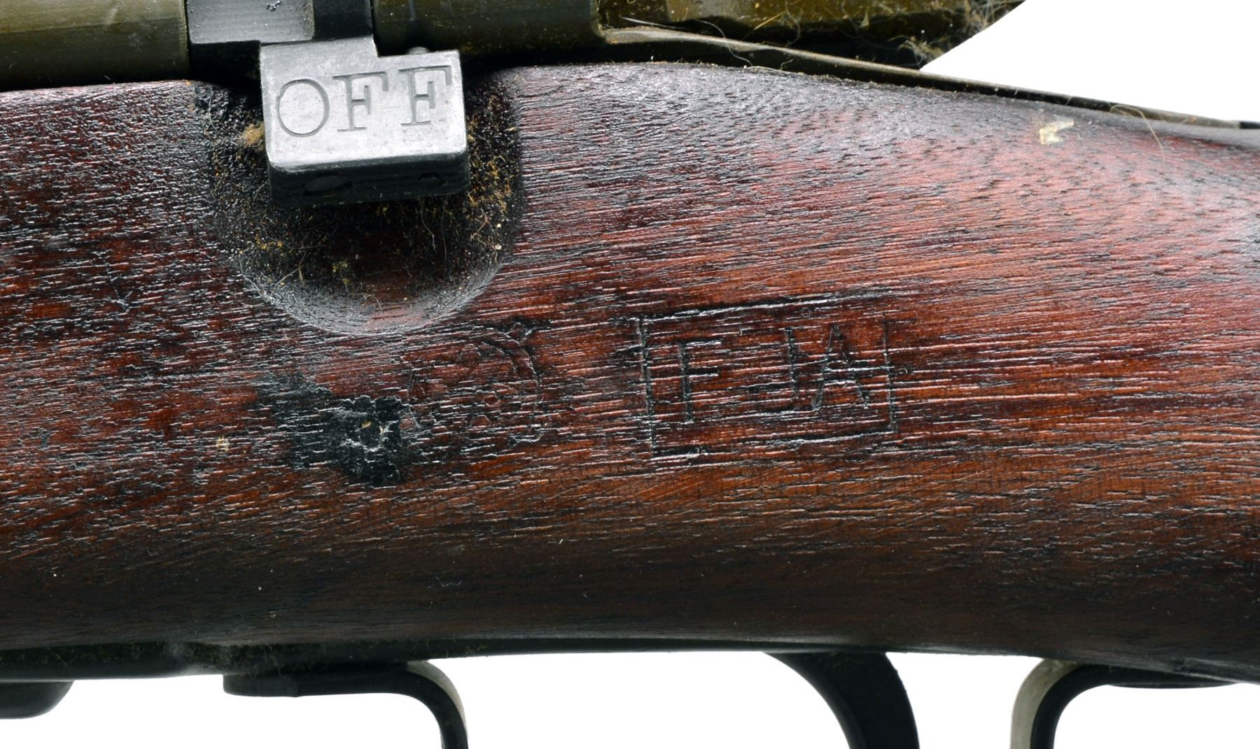 Cal. 30-06. S# 3987439. Bbl. 24". Green parkerized finish. Protected blade front sight w/ original adj. rear sight. Stamped bottom metal. Straight grip walnut stock & handguard. Left of stock has crossed cannons acceptance mark followed by "FJA" cartouche w/ "O.G." cartouche on left side of butt w/ "JS" near buttplate. Toeline behind trigger guard has circle "P" over "P". Flaming bomb on toeline between swivel & buttplate. CONDITION: 90% parkerized finish showing scattered surface corrosion. Wood has dark appearance w/ lightly crazed added finish. Bore is bright w/ strong rifling. PROVENANCE: Estate Collection of Dan Poppen. (20-207/DS). CURIO. $400-600.