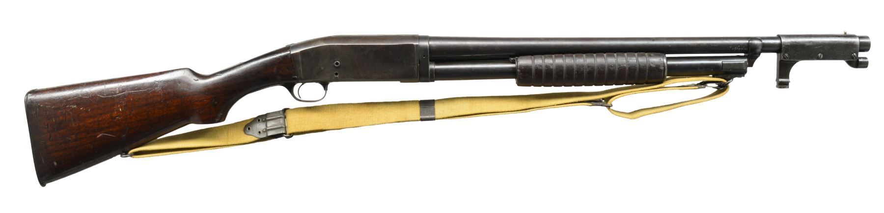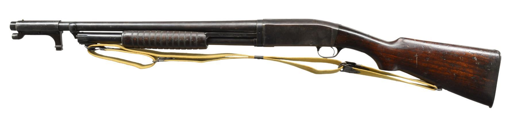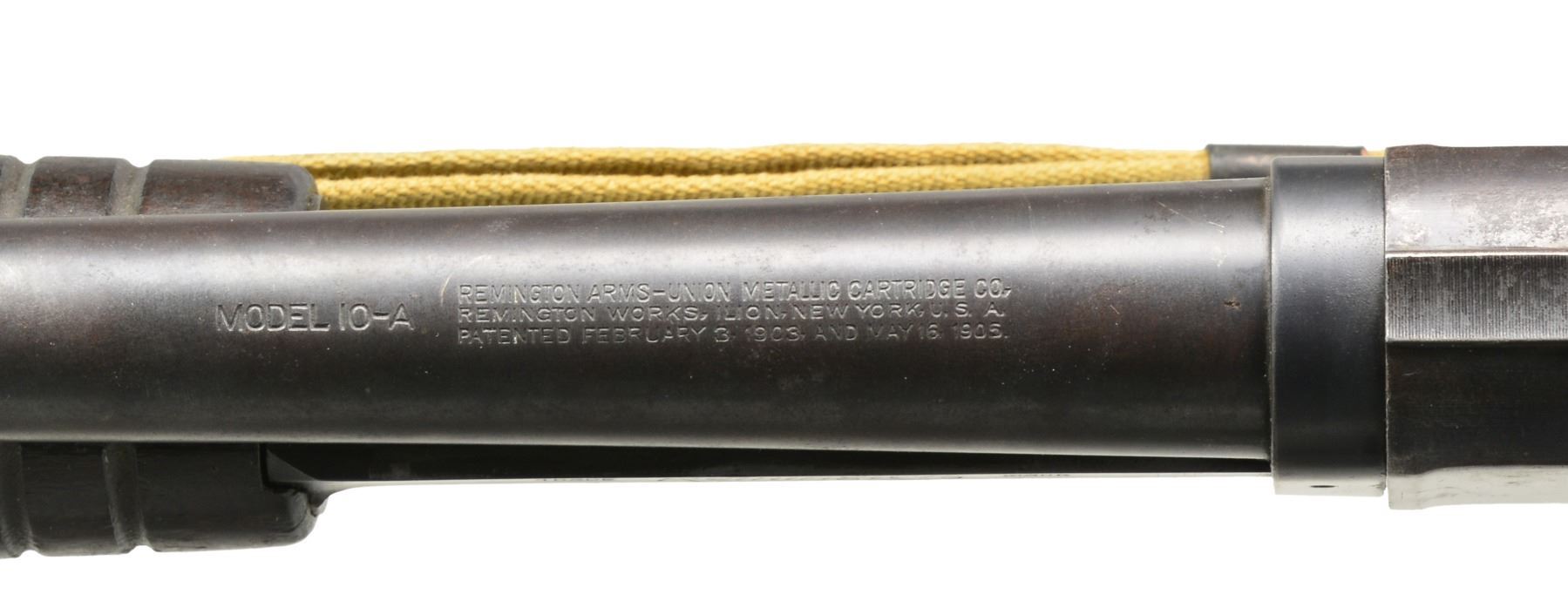Cal. 12 Ga., 2 3/4". S# U162699. Bbl. 22 13/16". Takedown. Cyl. Bore. Receiver marked only w/ S#. Bbl. Marked on top "MODEL 10-A REMINGTON ARMS-UNION METALLIC CARTRIDGE CO. REMINGTON WORKS, ILION, NEW YORK U.S.A. PATENTED FEBRUARY 3 1903 AND MAY 16 1905". Shotgun is in correct S# range for trench gun. Lacks martial markings on receiver. Sm. "REP" cartouche on right side of bbl. Correct 3 screw bayonet lug. Bayonet lug marked only w/ partially obscured eagle acceptance mark on face. Unmarked pistol grip walnut stock set w/ grooved slide handle. Buttstock has factory fitted inletted swivel. Replacement steel checkered Winchester type buttplate w/ widow"s peak. Handguard assembly is not present but bbl. extension has threaded hole on right & left side. Tan Kerr Nobuckl sling. CONDITION: stock set has moderate wear, dents, staining & scratches. 1" Crack behind upper tang. Buttplate is proud of wood in most areas w/ crack & sm. missing chips at heel. Takedown is loose. Original blue is turning overall gray & patina w/ wear, dents, scratches & tool marks w/ spots of oxidation & fine pitting throughout. Lock screw is missing from trigger guard retaining screw. Very good bright shiny bore w/ several sm. streaks of fouling. Bbl. has hole approx. 1/8" in diameter drilled nearly through in underside midway of chamber. (20-1193/RW). MODERN. $1,000-1,500.