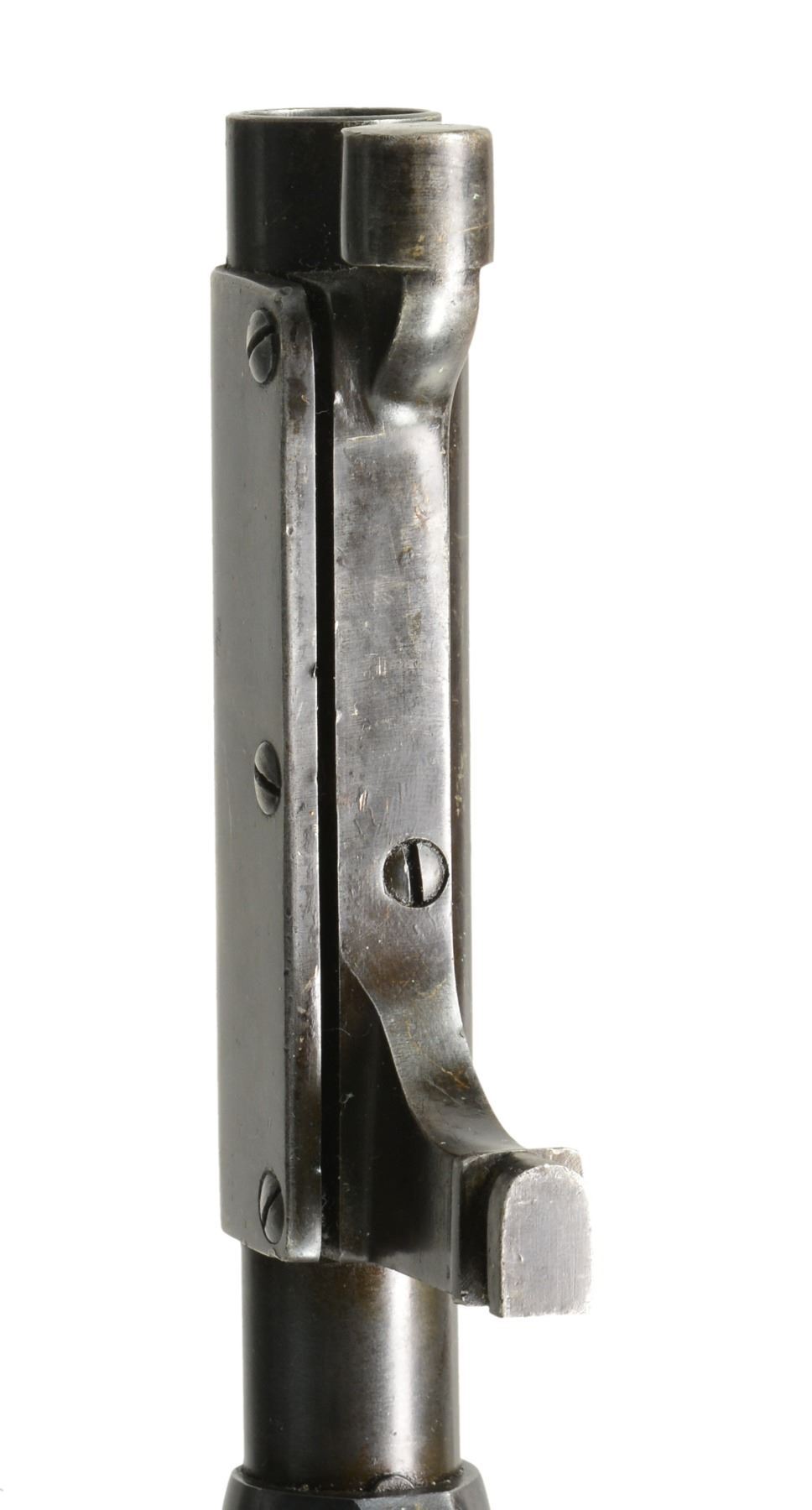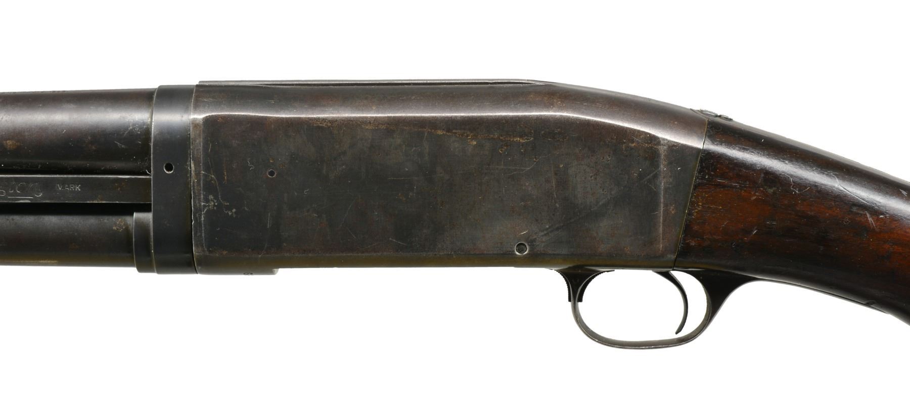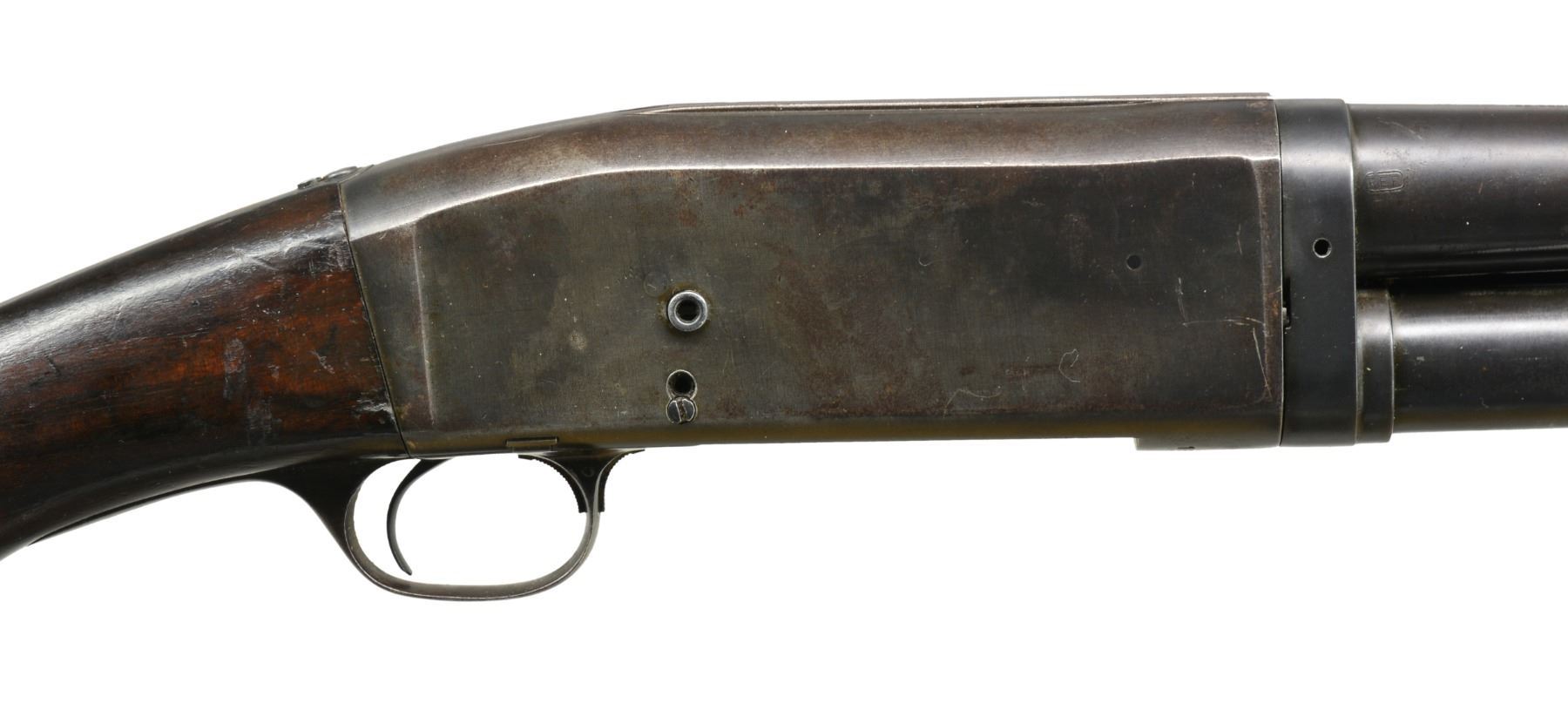 Cal. 12 Ga., 2 3/4". S# U162699. Bbl. 22 13/16". Takedown. Cyl. Bore. Receiver marked only w/ S#. Bbl. Marked on top "MODEL 10-A REMINGTON ARMS-UNION METALLIC CARTRIDGE CO. REMINGTON WORKS, ILION, NEW YORK U.S.A. PATENTED FEBRUARY 3 1903 AND MAY 16 1905". Shotgun is in correct S# range for trench gun. Lacks martial markings on receiver. Sm. "REP" cartouche on right side of bbl. Correct 3 screw bayonet lug. Bayonet lug marked only w/ partially obscured eagle acceptance mark on face. Unmarked pistol grip walnut stock set w/ grooved slide handle. Buttstock has factory fitted inletted swivel. Replacement steel checkered Winchester type buttplate w/ widow"s peak. Handguard assembly is not present but bbl. extension has threaded hole on right & left side. Tan Kerr Nobuckl sling. CONDITION: stock set has moderate wear, dents, staining & scratches. 1" Crack behind upper tang. Buttplate is proud of wood in most areas w/ crack & sm. missing chips at heel. Takedown is loose. Original blue is turning overall gray & patina w/ wear, dents, scratches & tool marks w/ spots of oxidation & fine pitting throughout. Lock screw is missing from trigger guard retaining screw. Very good bright shiny bore w/ several sm. streaks of fouling. Bbl. has hole approx. 1/8" in diameter drilled nearly through in underside midway of chamber. (20-1193/RW). MODERN. $1,000-1,500.