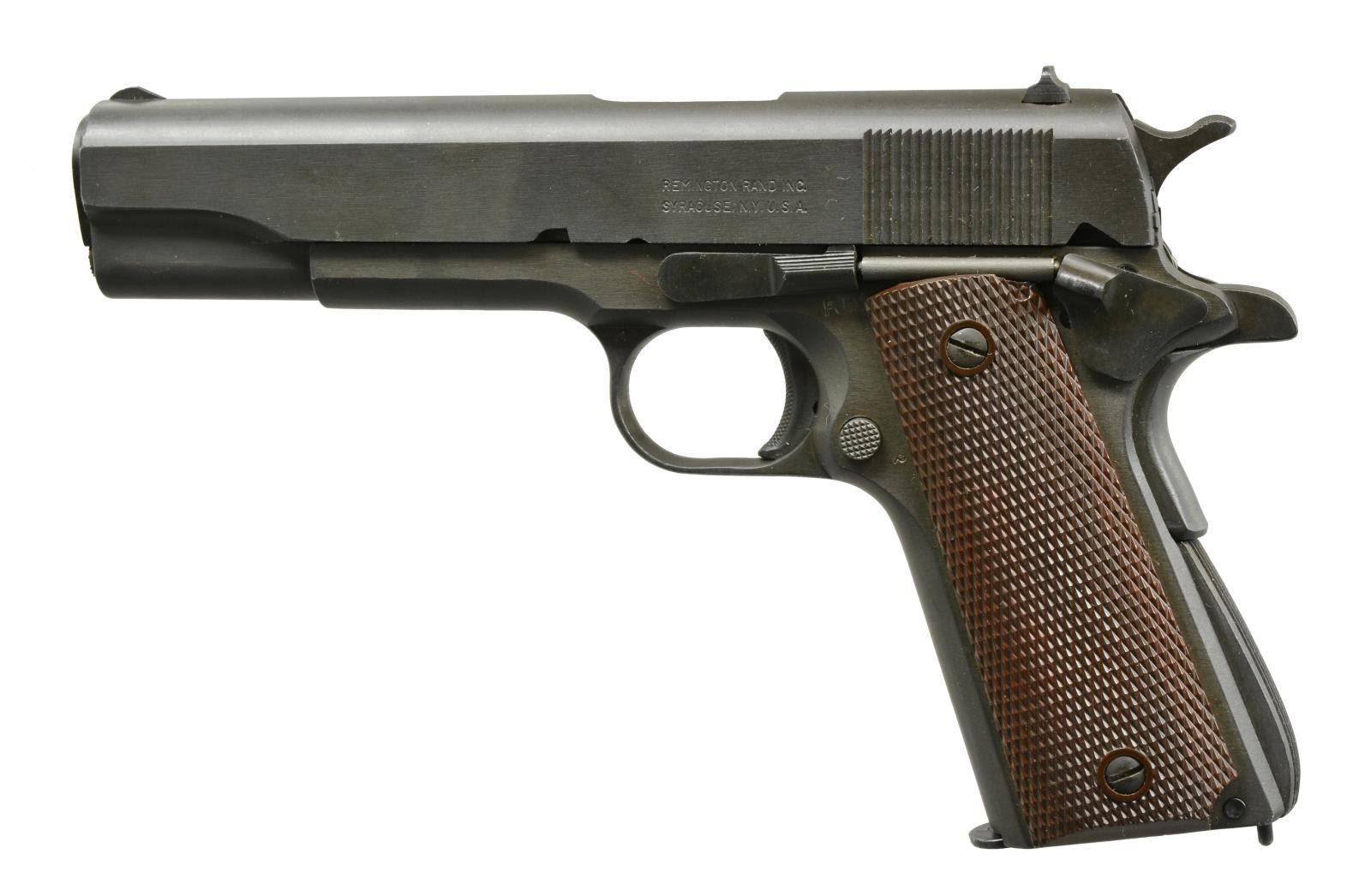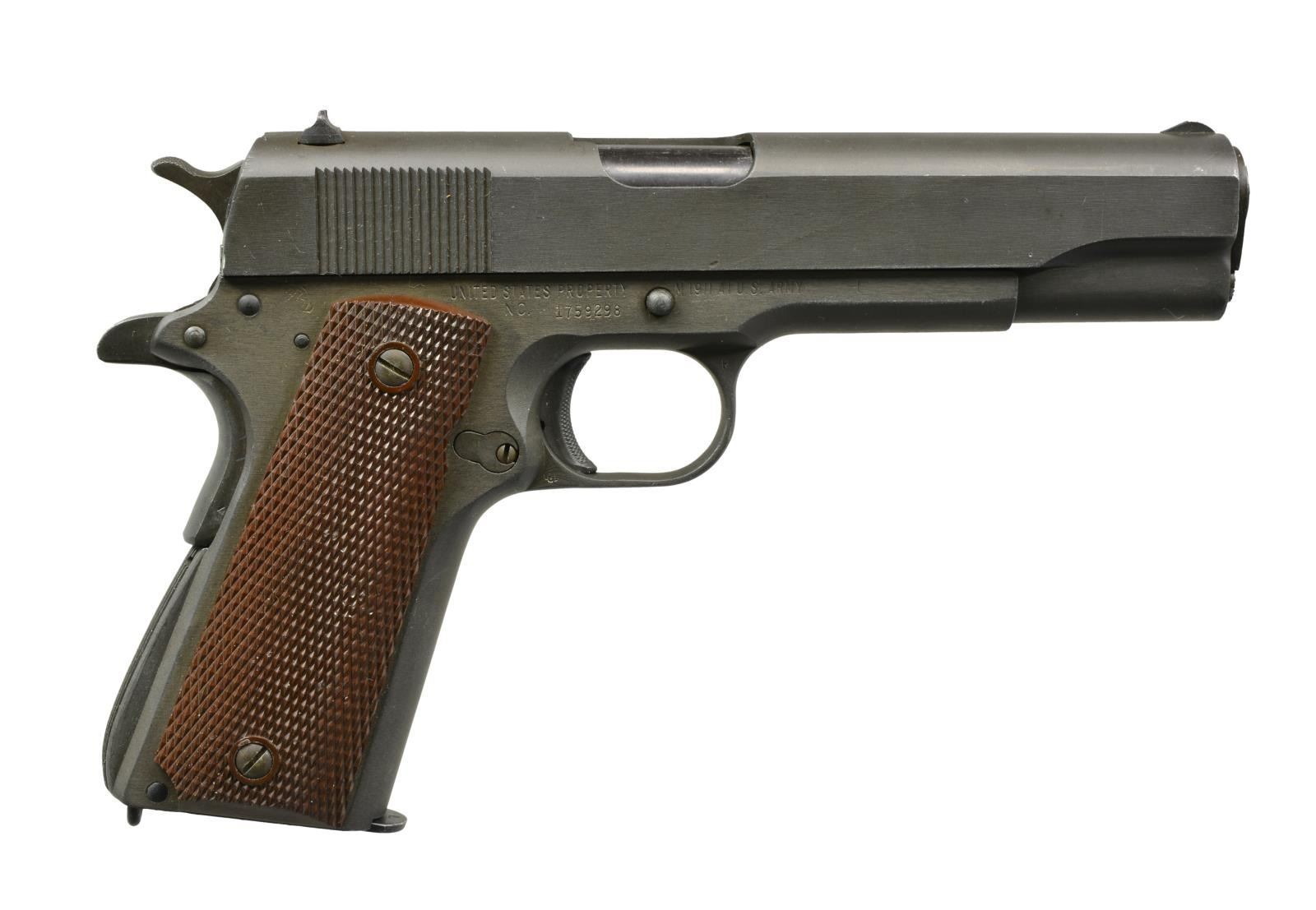 Cal. 45 ACP. S# 1759298. Proper 5" High Standard bbl. marked "P" on left side of leg & "HS" on right side. Top of slide & left side of frame below mag. release have "P" firing proofs. "FJA" inspectors mark is found on left side of frame below slide lock. Right side of frame has partially visible crossed cannons Ordnance escutcheon. Brown plastic grips w/ lg. reinforcement rings. MAGS: 1 M.S. Little Co. 7 rd. contract mag. UNATTACHED ACCESSORIES: repro. Model 1911 storage box contain wax paper & cleaning rod. CONDITION: 98% reparkerized finish showing scattered sm. marks. Grips show a few chipped diamonds. Bore has lightly worn rifling showing scattered areas of pitting. (20-1938/DS). CURIO. $900-1,200.