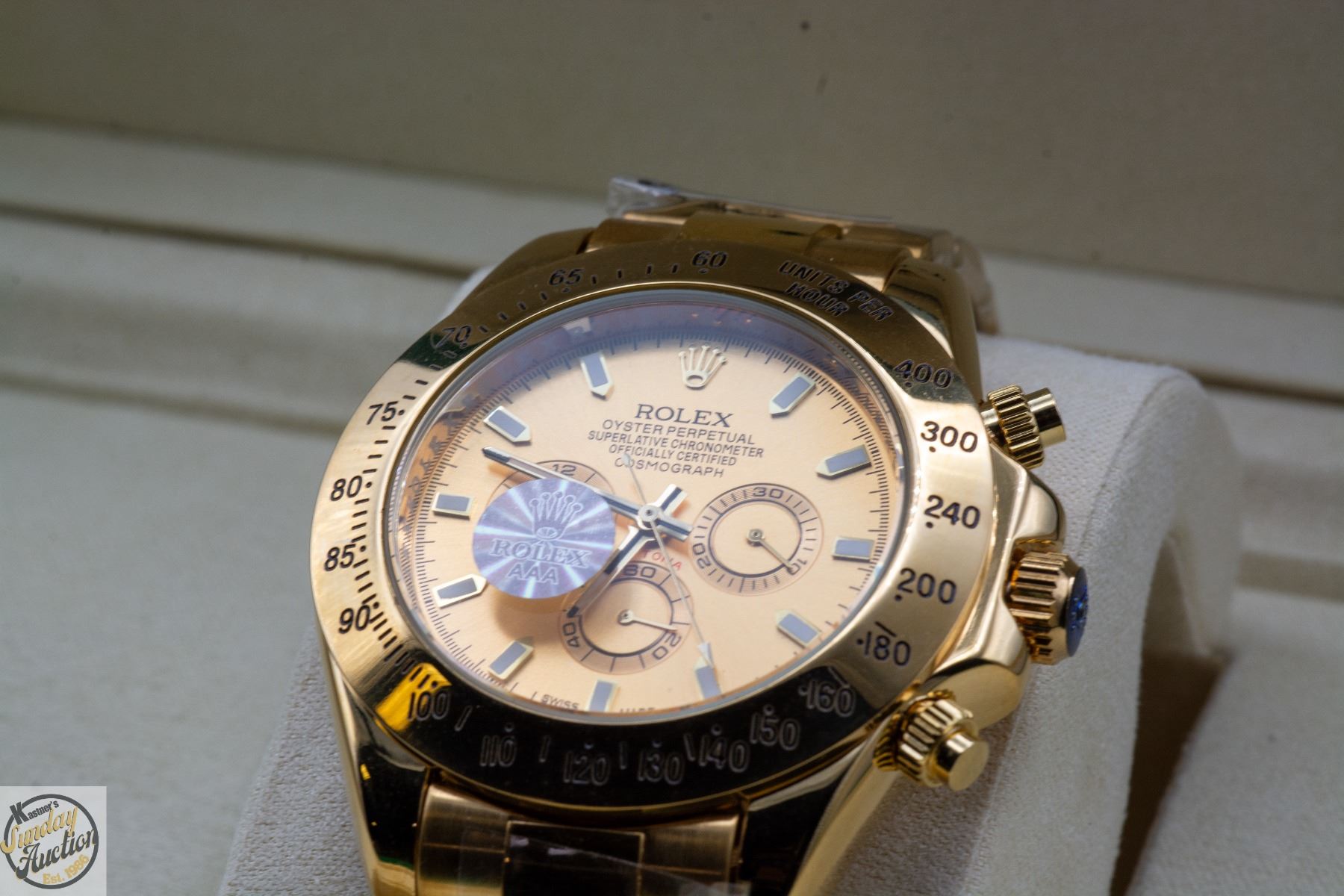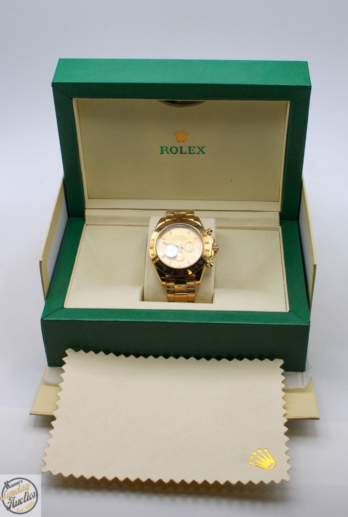 REPLICA WATCH, GOLD DIAL WITH WHITE INDEXES GOLD BEZEL AND CROWN, 904L STAINLESS STEEL CASE (THE SAME STEEL USED IN AUTHENTIC ROLEX WATCHES). GOLD OYSTER STEEL BRACELET. FULL SET WITH BOX, PAPERS AND BAG. **ALL ITEMS MUST BE REMOVED BY 5PM SATURDAY, JANUARY 3RD 2026. ALL REMAINING ITEMS WILL BE SUBJECT TO A $6.00 PER DAY STORAGE CHARGE. ANY ITEMS REMAINING AFTER MONDAY, JANUARY 19TH 2026 WILL BE CONSIDERED FORFEITED. NO REFUNDS WILL BE ISSUED FOR FORFEITED ITEMS. TO SCHEDULE A PICK UP APPOINTMENT CLICK HERE