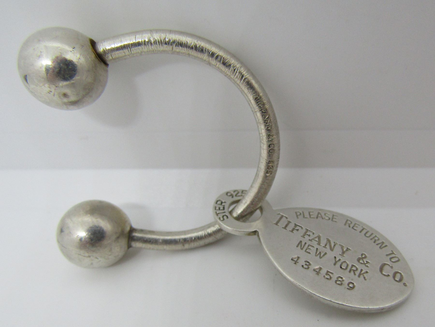 SIGNED "PLEASE RETURN TO TIFFANY & CO. NEW YORK 434589 STER 925". KEYRING IS ALSO MARKED "TIFFANY & CO 925". MEASURES 30MM BY 53MM. WEIGHS 6.4 GRAMS. VINTAGE ESTATE USED CONDITION WITH TIFFANY POUCH. USASHIPPING $5.