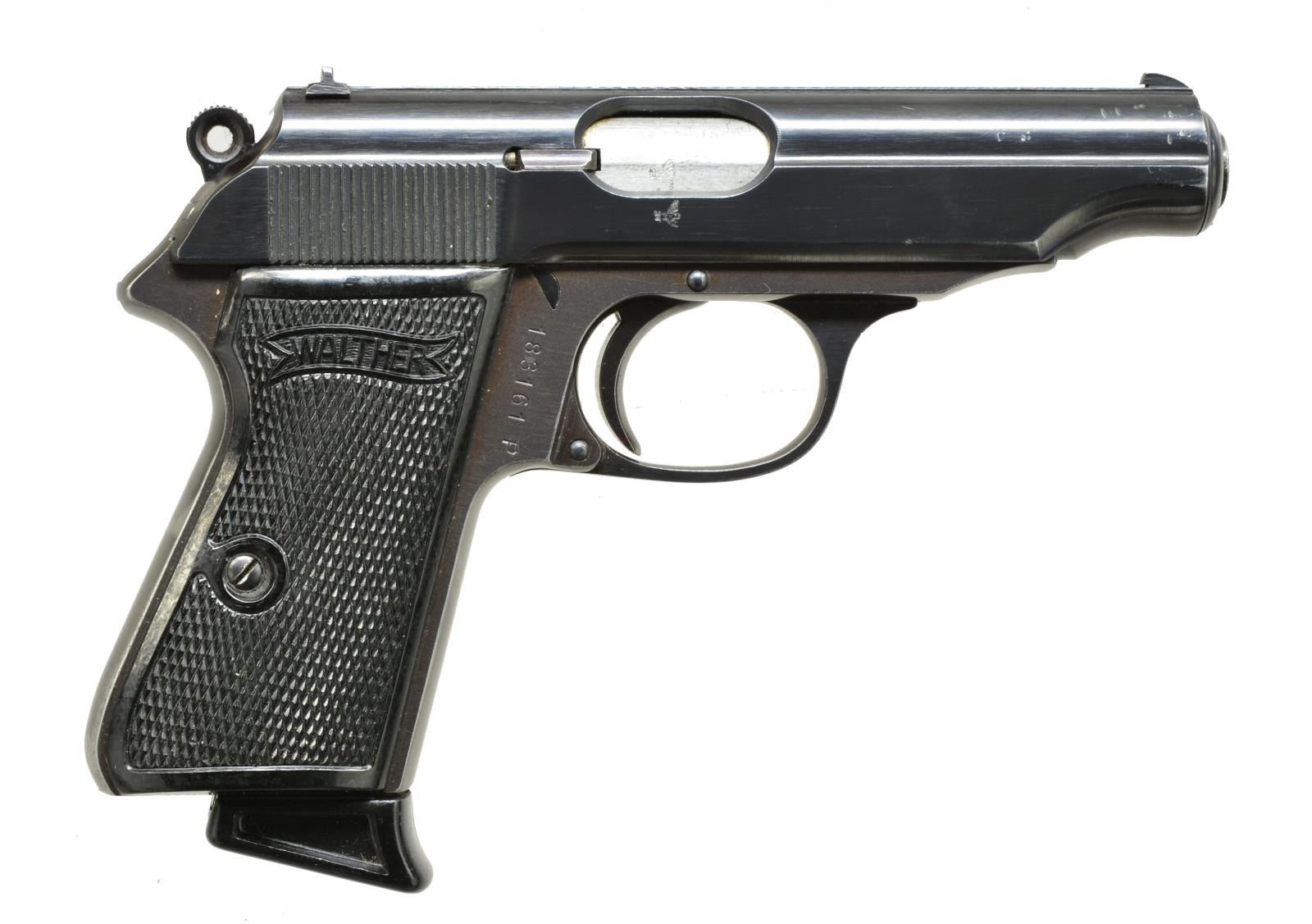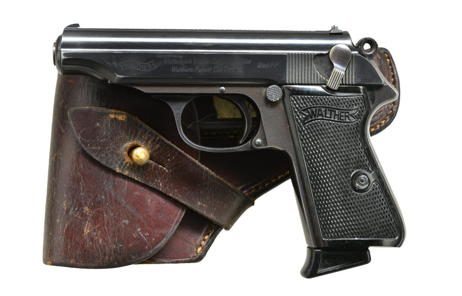 & SPARE MAG. Cal. 7.65 mm. S# 183161P. Standard configuration. Bbl. & high polish slide w/ Eagle “N” proofs. Front of frame engraved “R.J.” (Reich Justice Ministry). Black grips. UNATTACHED ACCESSORIES: 1 PP marked mag. w/ black plastic extension is housed in brown holster w/ owner’s name inside flap w/ spare metal base mag. CONDITION: very fine. Slide w/ correct scratch S# has some scattered sm. dings at right front & shows some high edge & holster wear. Frame w/ low luster original blue shows some holster wear on backstrap, thinning on front. Bright, shiny bore. Mechanically good. Holster has darkened & has some marks & rubs. Belt loop replaced. (20-3284/MGM). CURIO. $1,000-1,500.