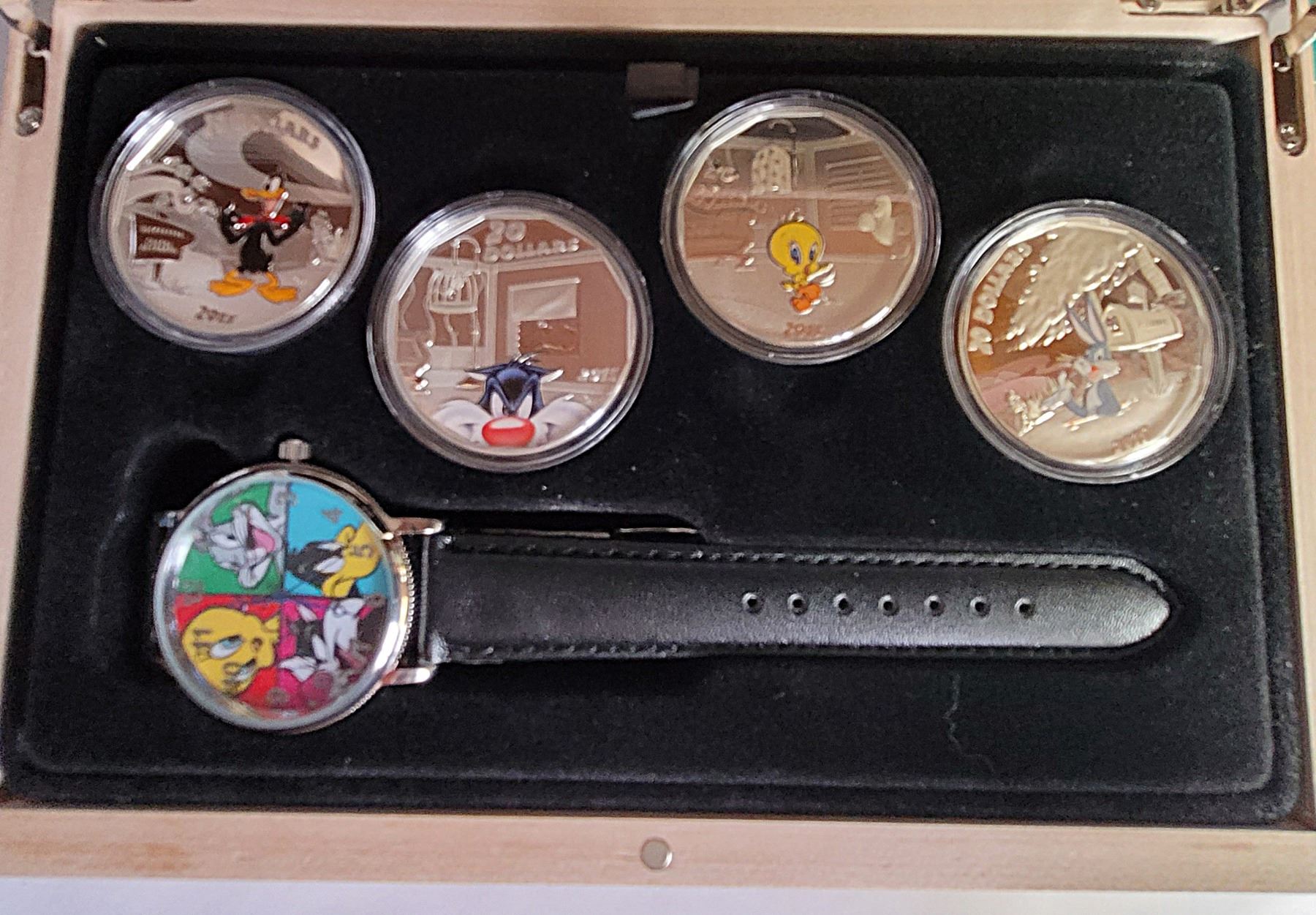 COLLECTION, 4 $20.00 , 99.9% PURE SILVER COINS, AND LOONEY TOONS WATCH WITH BLACK LEATHER BAND, IN WOODEN COLLECTORS' BOX & COA **ALL ITEMS MUST BE REMOVED BY 5PM SATURDAY, MARCH 14TH 2026. ALL REMAINING ITEMS WILL BE SUBJECT TO A $6.00 PER DAY STORAGE CHARGE. ANY ITEMS REMAINING AFTER MONDAY, APRIL 6TH 2026 WILL BE CONSIDERED FORFEITED. NO REFUNDS WILL BE ISSUED FOR FORFEITED ITEMS. TO SCHEDULE A PICK UP APPOINTMENT CLICK HERE
