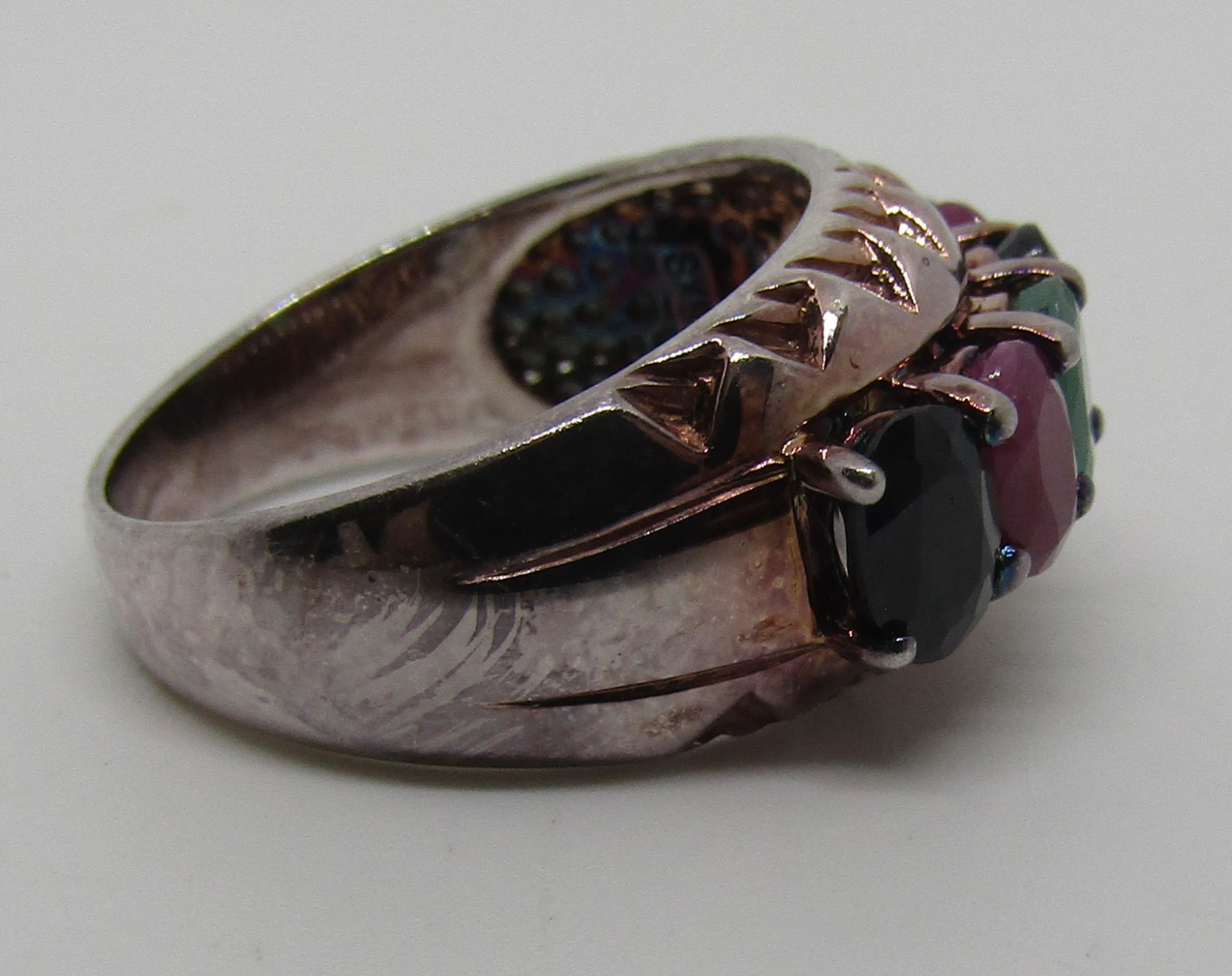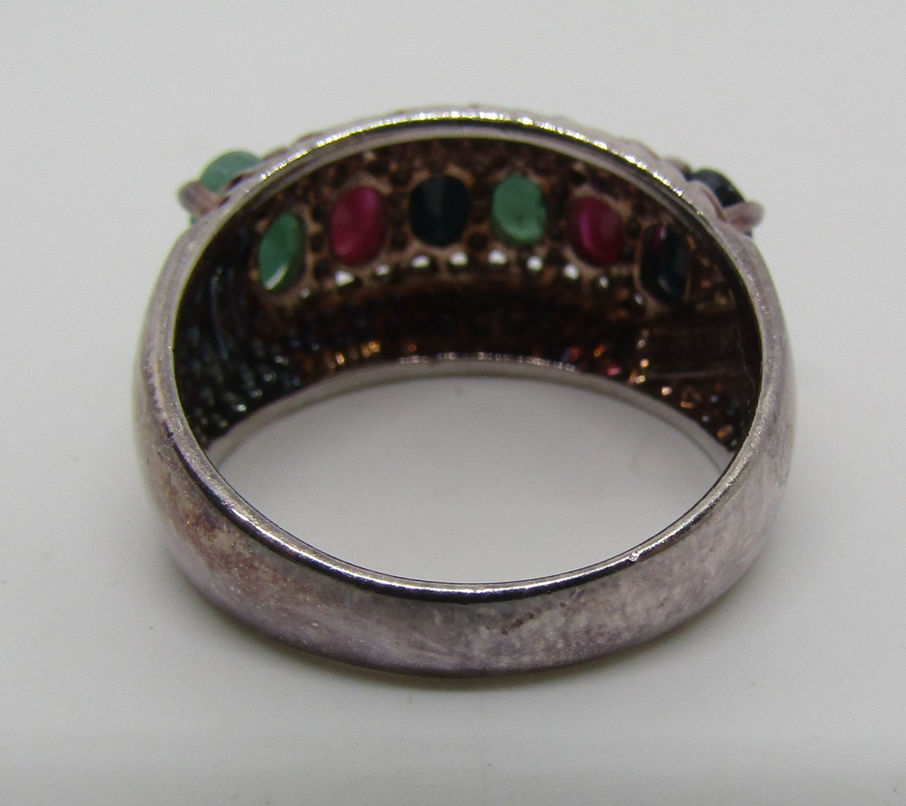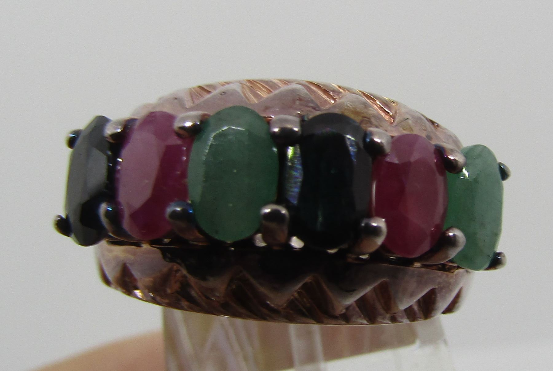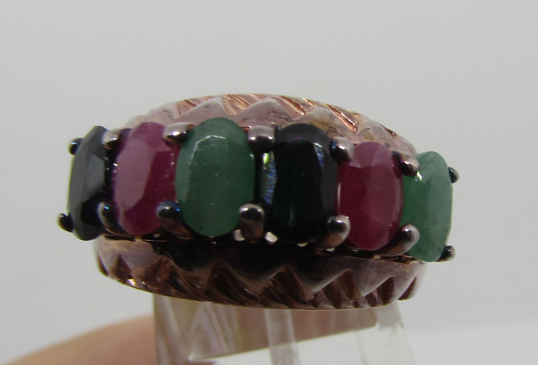 HUGE LINE VINTAGE ESTATE HALLMARKED "SX" ROSE GOLD ON STERLING SILVER WITH TWO 4MMX 6MM EMERALDS, RUBIES AND SAPPHIRES. TOP 12MM. SIZE 8. WEIGHS 7.2 GRAMS. EXCELLENT USED CONDITION. USA SHIPPING $5.