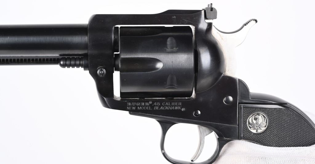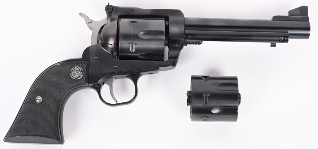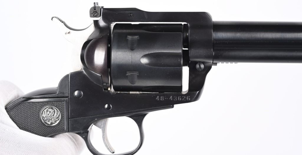SERIAL 48-43626. BARREL 5,5". CALIBER .45. COLT / ACP 2-CYLINDERS. Features blue finish, black checkered grips, target rear sight, six shot single action. Condition. Near mint with light handling and bit of wear on top of sight. MODERN