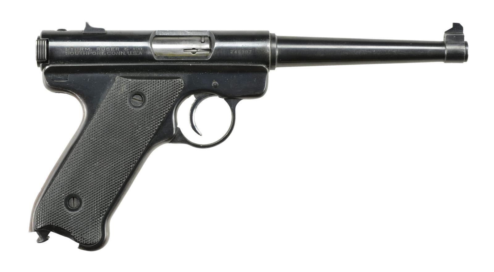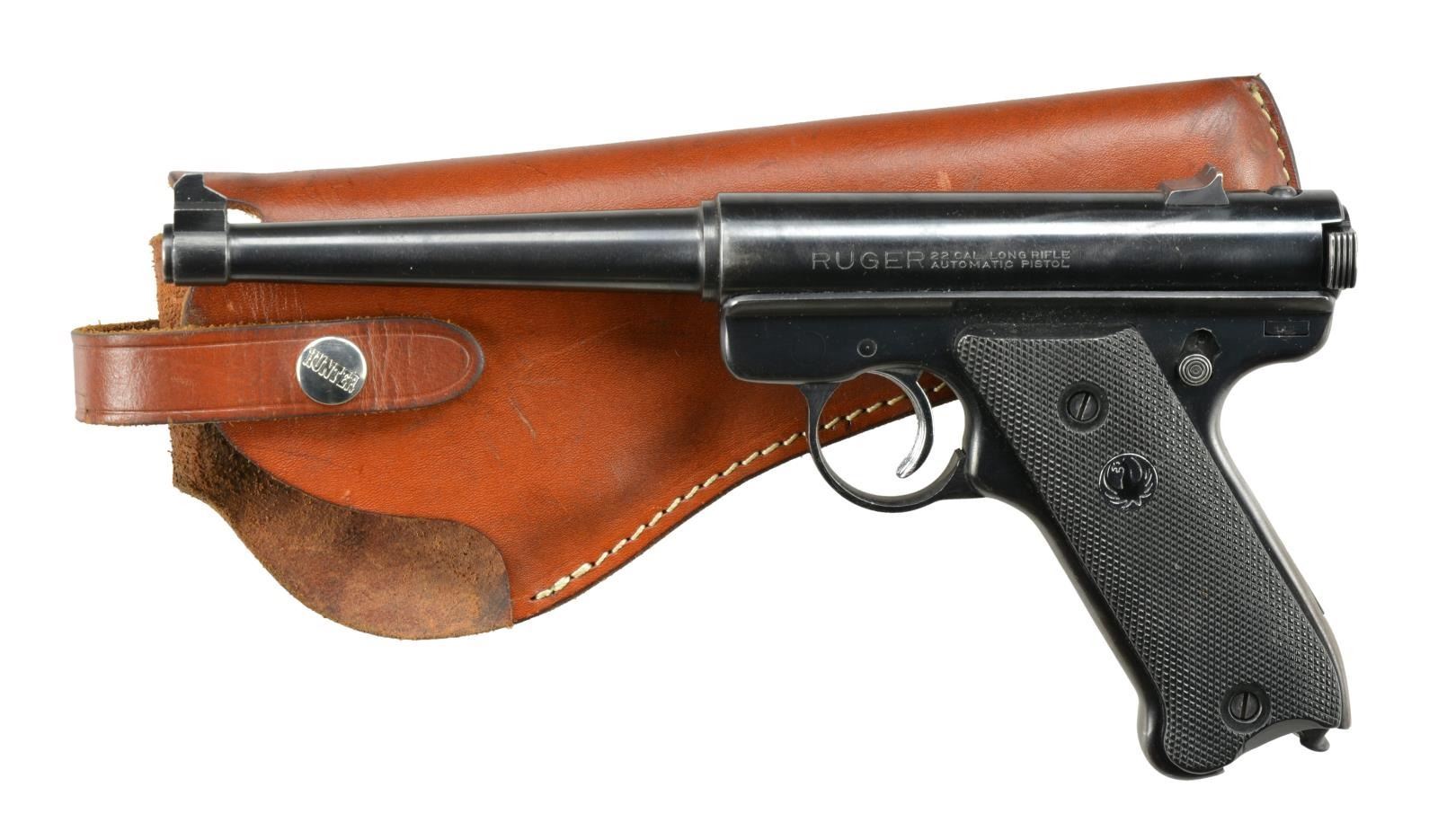 Cal. 22 LR. S# 248007. Bbl. 4 3/4" w/ Patridge front sight & drift adjustable square notched rear. Mfg. 1963 (1949-1982) w/ blued finish, chromed trigger, black eagle checkered hard rubber grips & aftermarket quick release mag. latch. MAGS: NONE; readily available from Ruger & various retailers. UNATTACHED ACCESSORIES: very good Hunter 4500-4 brown leather sportsman style holster w/ retaining strap. CONDITION: very good finish w/ light thinning & slight holster wear. Very good grips & near excellent bore. (22-2844/NW). CURIO. $250-350.