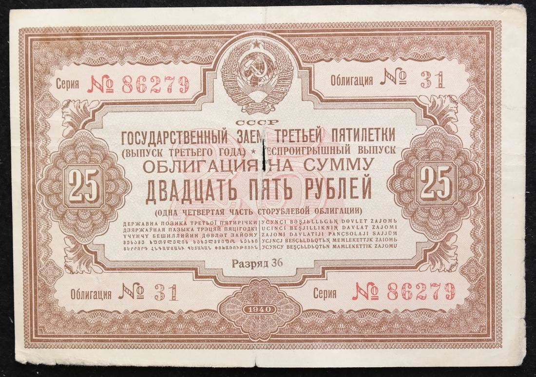 Includes 1938 10R, 1940 25R, 1939 50R, 1936 100R, 1937 100R, 1938 100R and 1939 100R state bonds, mixed condition but generally sound and F-VF.
