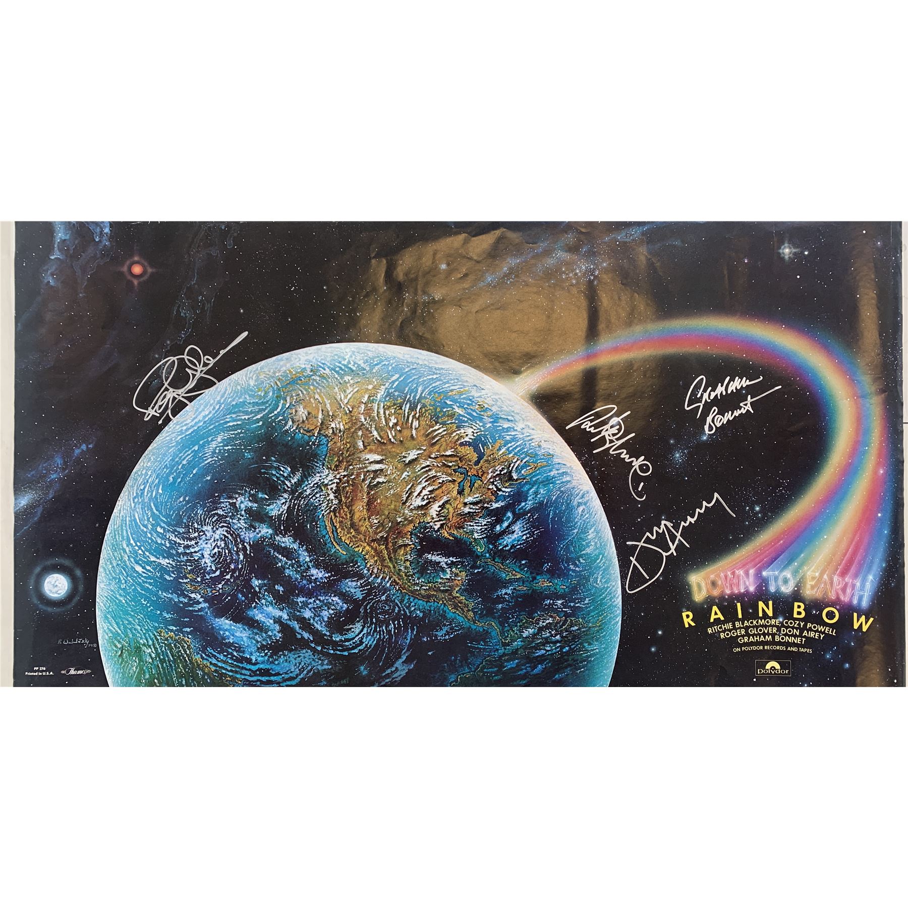 Rainbow Down To Earth signed poster autographed by Ritchie Blackmore, Roger Glover, Don Airey and Graham Bonnet. 19x36 inches