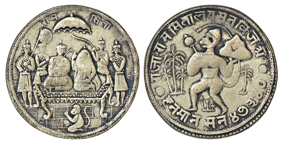 Ramatanka, mid-19thcentrury, base silver token, 21.50g. Obv: Rama and Sita seated on darbar platform, Hanuman sits beneath platform, Devanagari legend Ram, Sita at top. Rev: Hanuman running left, holding mace and mount Sanjeevi, palm tree on each side, Devanagari legend Raja Ram, Sita, Lakshman Ki Jay above, Hanuman sanah 47340 below; broad flan, 35.31mm.