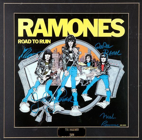 Ramones "Road To Ruin" Signed Lp. Signed by Dee Dee, Joey, Johnny, and Marky Ramone. Released on Sept. 22, 1978, Road To Ruin was the fourth album by the American punk band and the first to feature Marky as the drummer instead of founding member Tommy. In a 23 x 19 in. frame. Not viewed out of frame.