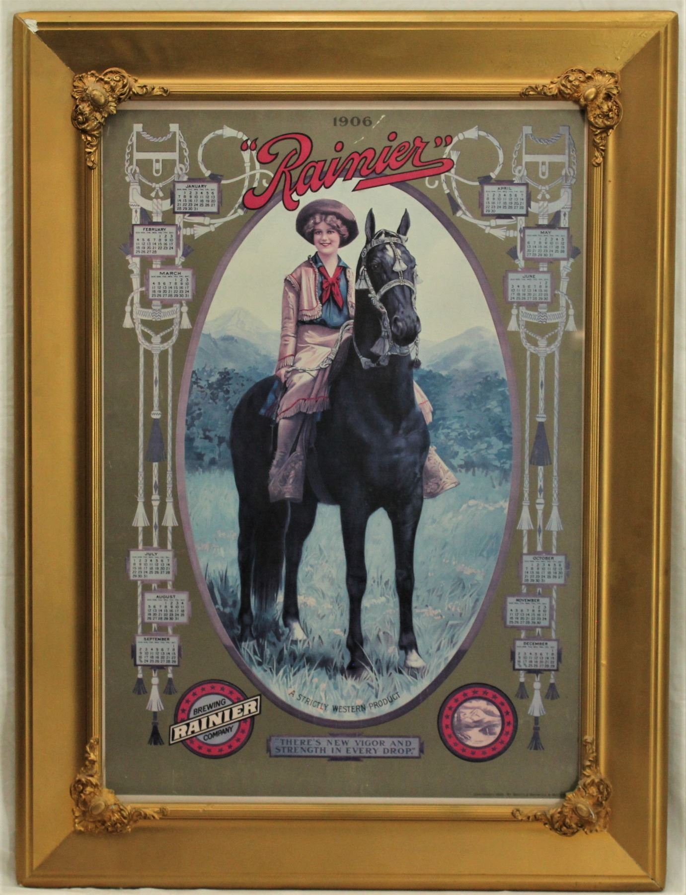 a 1906 Ranier Brewwing Co. advertising calendar, with a wonderful image of a horseback cowgirl, and horsehair bridle designs. In its vintage frame, image measuring 20" x 29".